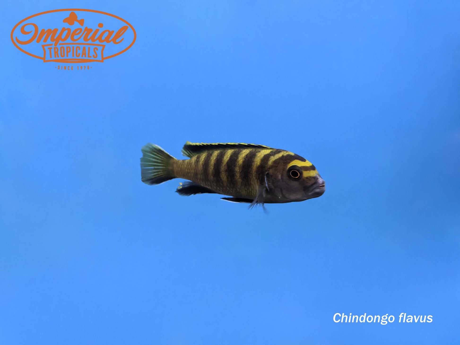 Remarks: Chindongo flavus was previously classified as Pseudotropheus flavus. Males will sport yellow and black stripes through the body, while females are brown with subtle stripes visible.