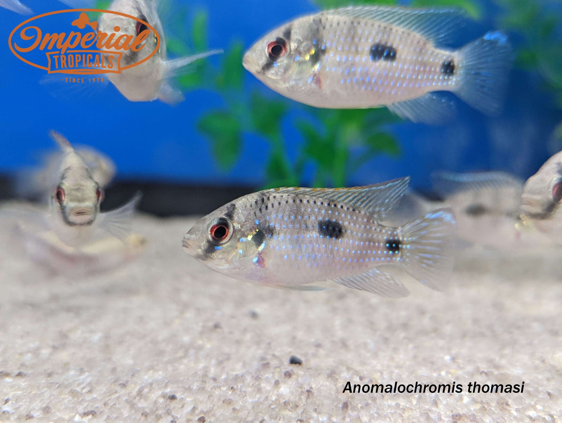 Remarks: African Butterfly Cichlids (Anomalochromis thomasi) are found in Guinea and Sierra Leone, where they live in forest streams underneath plenty of vegetation. They are happy in a variety of water conditions in the aquarium, however, as long as it is kept clean. They are fairly peaceful and stay under 4", making them perfect for a 55 gallon tank with Congo Tetras or other African schooling fish.