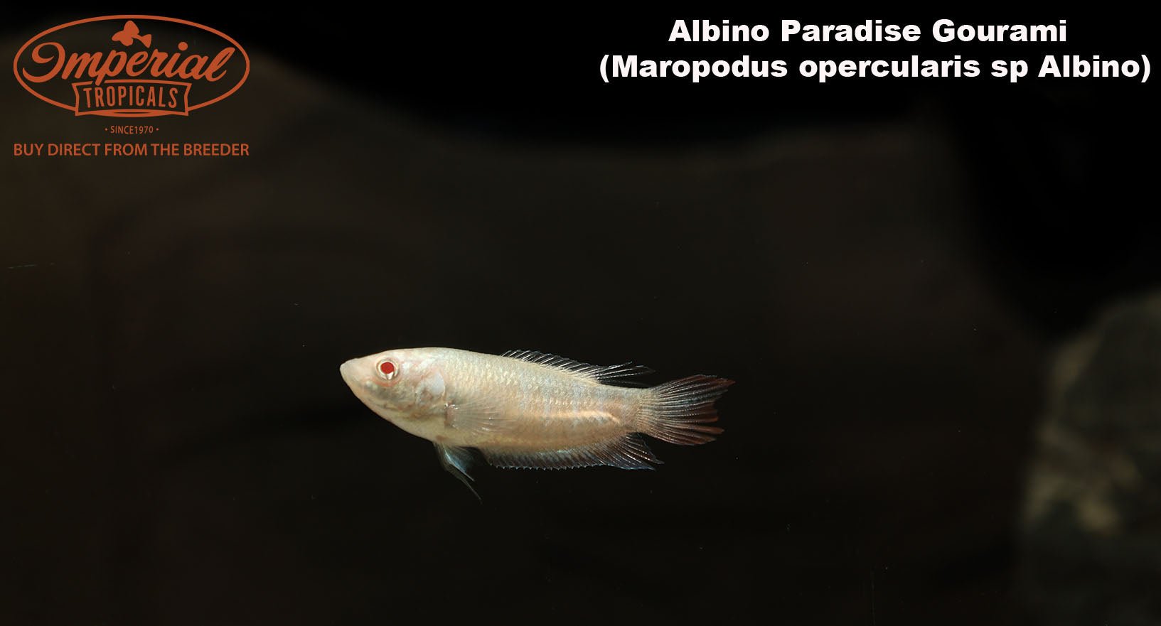 Remarks: The Albino Paradise Gourami (Macropodus opercularis) is an albino form of the Blue paradise Gourami with pinkish orange and bodies. They are from southeast Asia and prefer slower moving waters. These gouramies are aggressive and nip fish with long fins so they should only be kept with fast-moving, short-finned species such as larger danios. Both males and females have color, but males will have much more color when they mature with a lot red on the body.