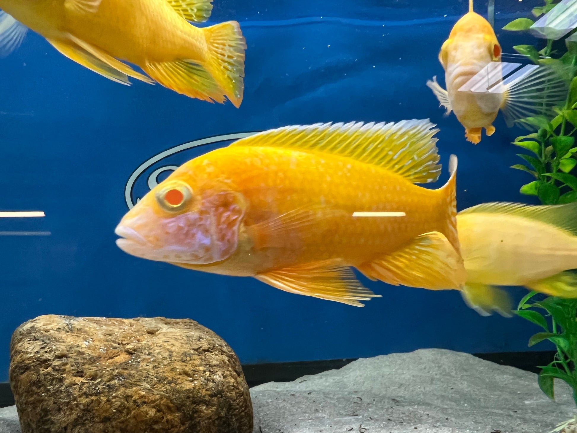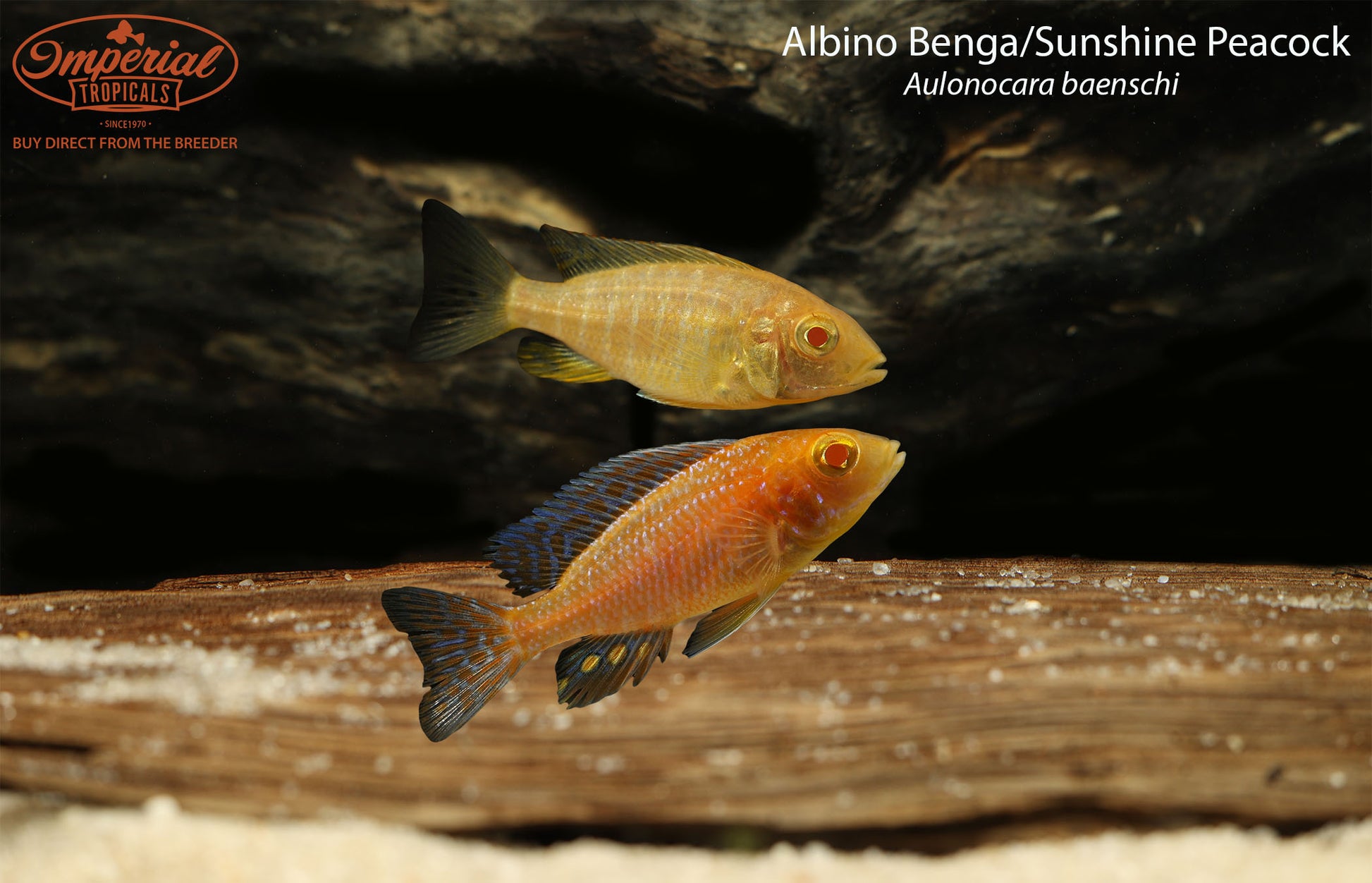 Remarks: An albino form of the Yellow Sunshine Peacock. These fish live over scattered rocks and a sandy bottom.