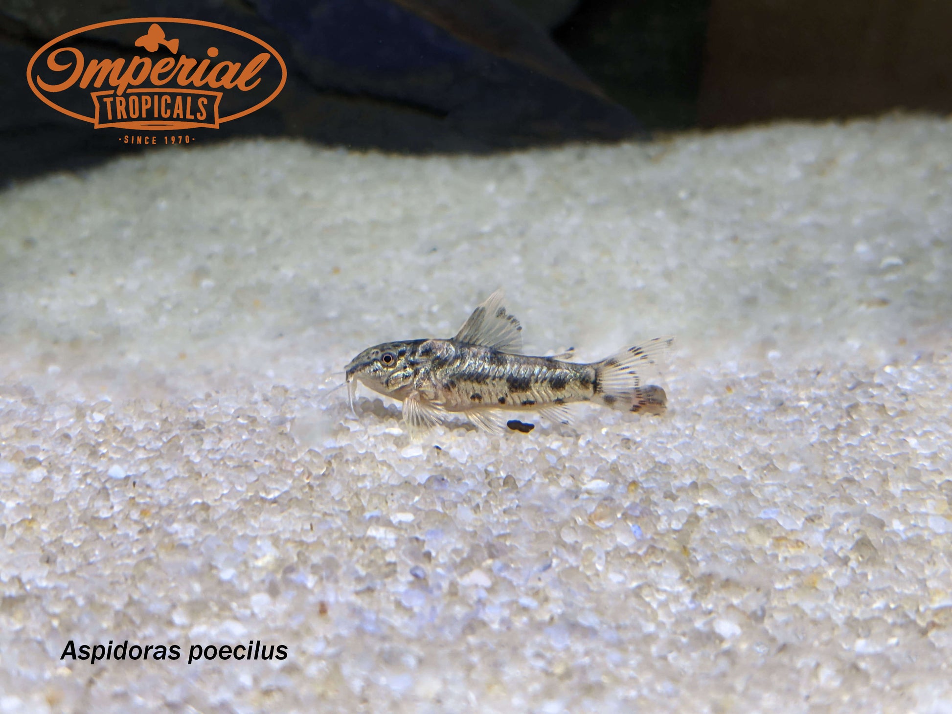 Remarks: Aspidoras poecilus are related to Corydoras, but differ in several ways. They have smaller eyes, longer bodies, and seem to be a bit more active in terms of swimming activity. Watching their shimmering gold bodies glide back and forth across the sand searching for food, and occasionally doing laps around a face of glass really draws one to this species. Unfortunately their beautiful gold sheen does not show up well in photos but is truly a sight to see in person. They are not very common in the hobby as they are found in Brazil, where exporting can be a challenge. While Aspidoras poecilus are small, they shouldn't be kept in tanks smaller than 20 gallons as they do not tolerate high levels of pollutants, need to be kept in large groups to feel safe, and are very active.