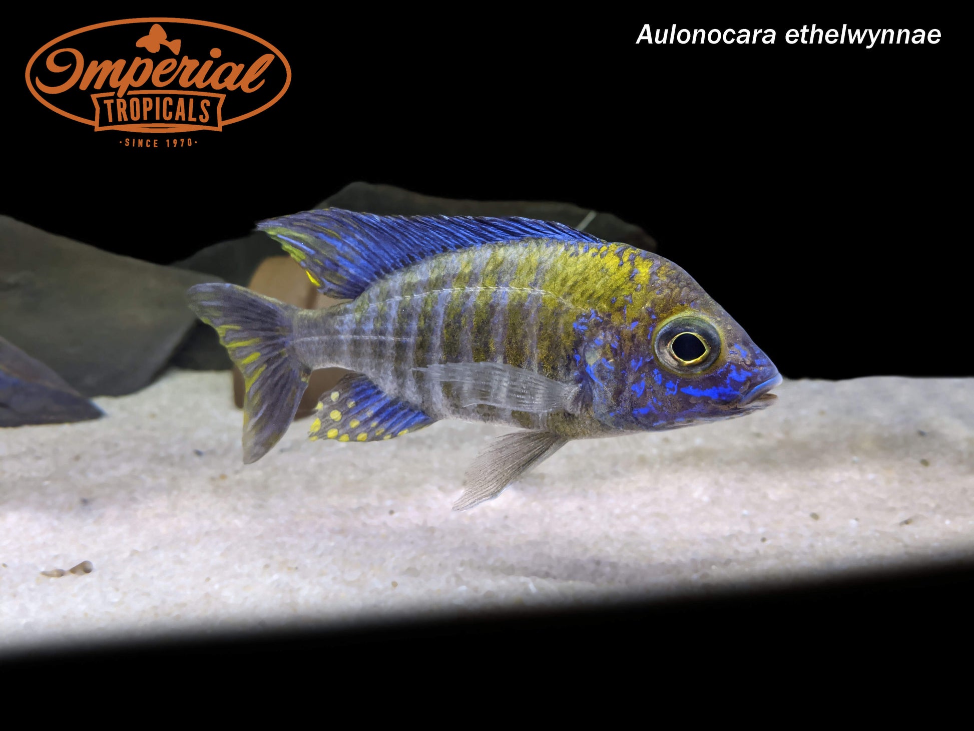 Remarks: Aulonocara ethelwynnae are endemic to Chitande Island in Lake Malawi. Males are yellow with bright blue fins and stripes, while females remain gray. They are typically found at depths deeper than 15 meters among scattered rocks. In the wild, they feed primarily by sifting the sand for tiny morsels of food so a sandy substrate should be provided to facilitate this behavior.