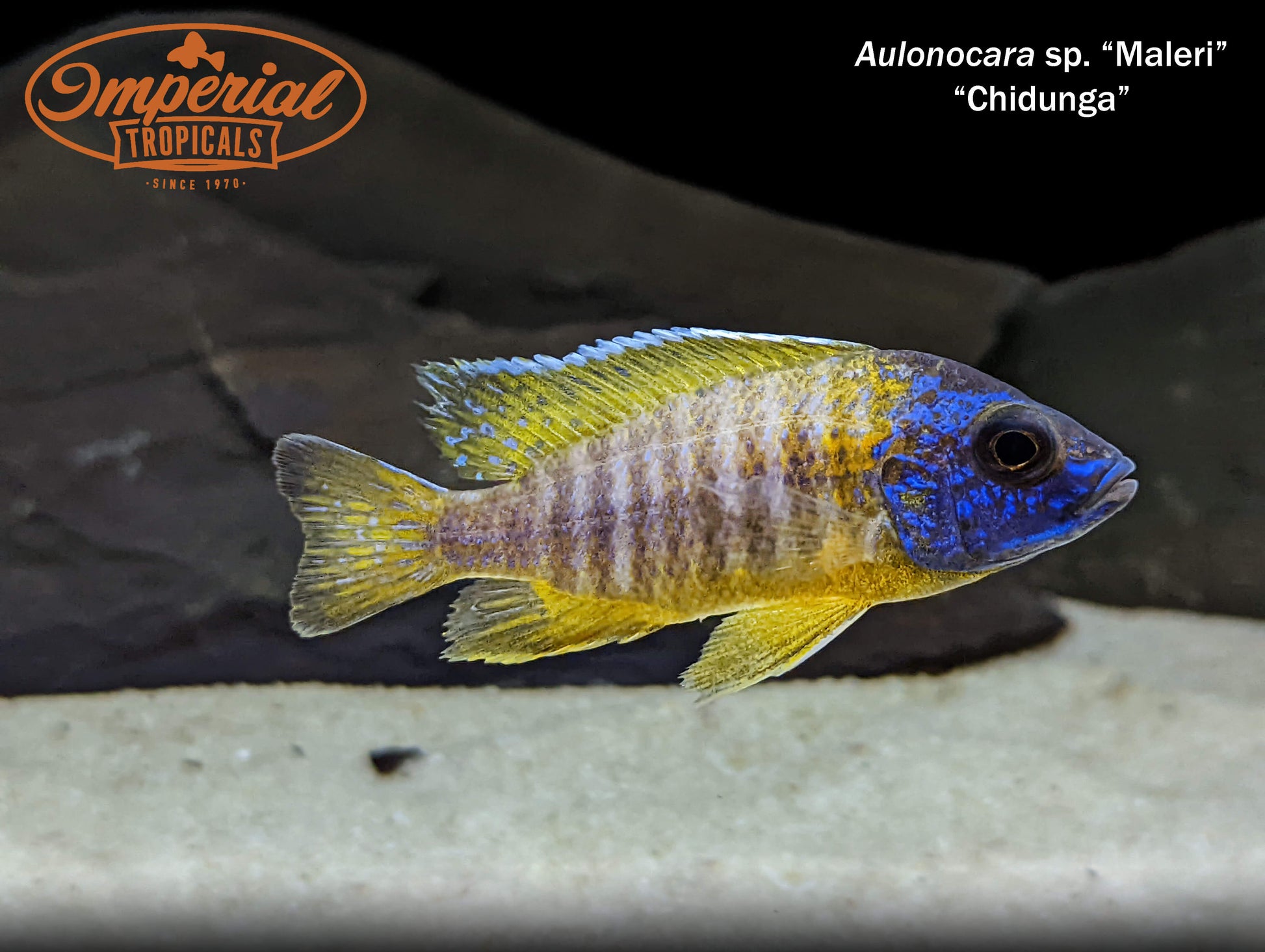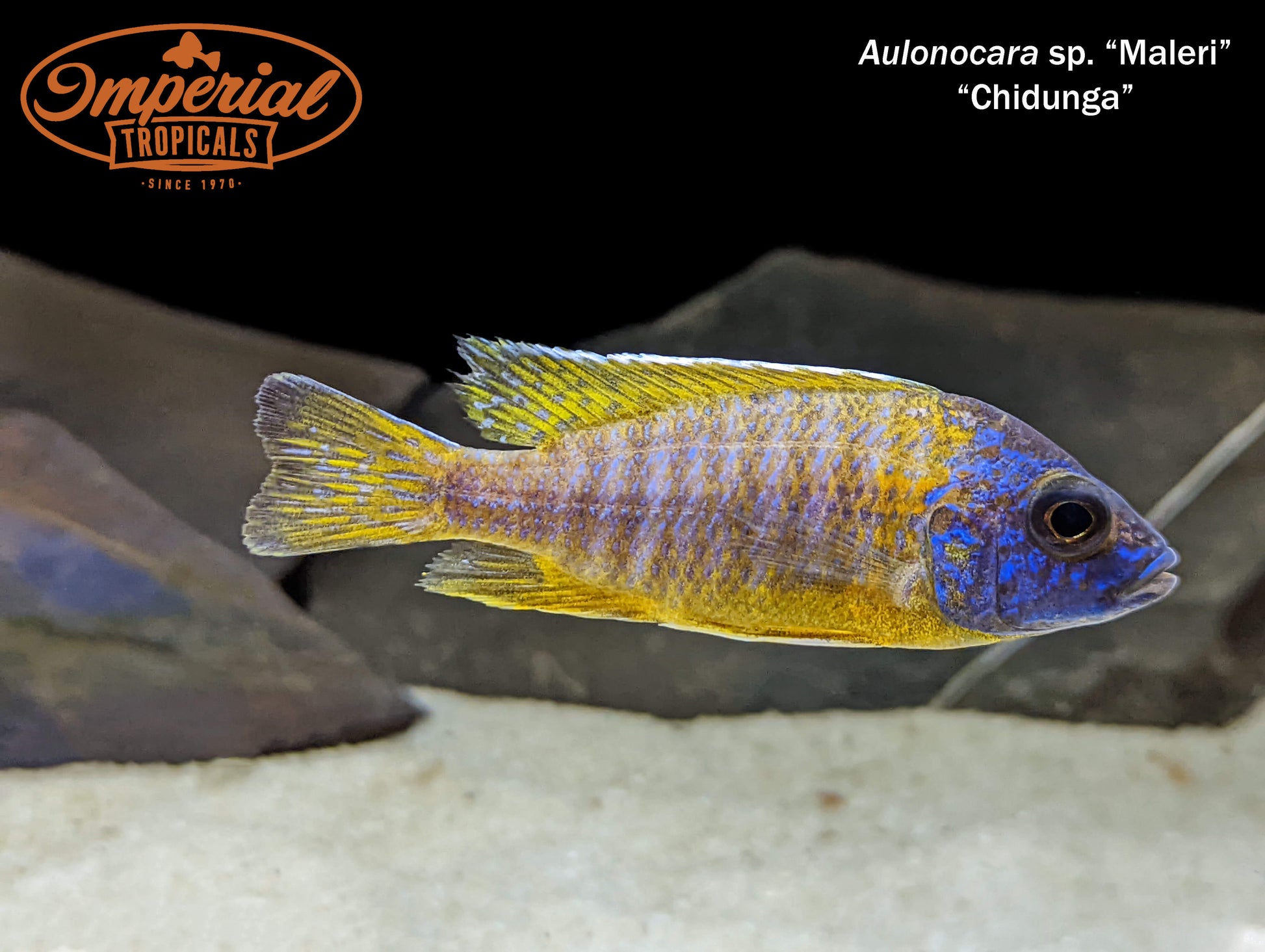 Remarks: The Maleri Peacock found around Chidunga Rocks may be a form of Aulonocara stuartgranti, but currently we refer to them as Aulonocara sp. Maleri "Chidunga." Females are gray, but males have bright yellow-orange bodies with regal blue faces.
