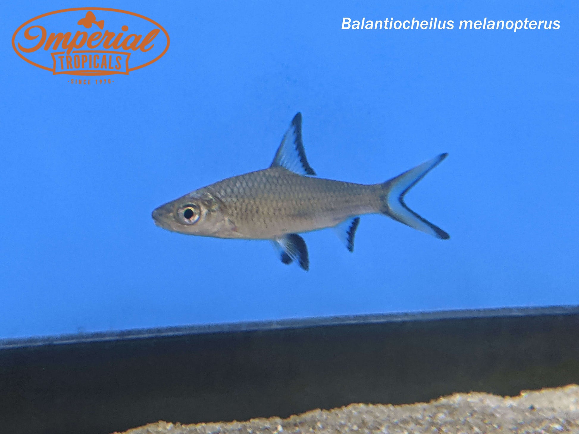 Remarks: Bala Sharks (Balantiocheilus melanopterus) are large, peaceful cyprinids from Borneo. They have silver bodies with black fins and a long torpedo body. They are compatible with most medium to large sized fish including Acara, Severums, Silver Dollars, and others. As this is a very large, active, schooling species, they need to be kept in tanks at least 200 gallons or better yet, a pond.