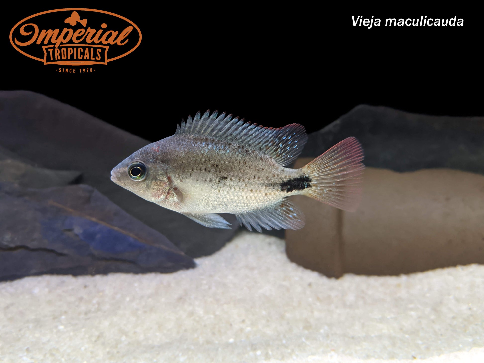 Remarks: Black Belt Cichlids (Vieja maculicauda) are large cichlids native to Central America, including Honduras, Guatemala, Nicaragua, and Costa Rica. They are primarily herbivorous and should not be fed a diet high in animal protein, but they will readily accept most prepared foods in the aquarium. Tanks should be furnished with rocks and driftwood, but plants are likely to be torn up or moved.