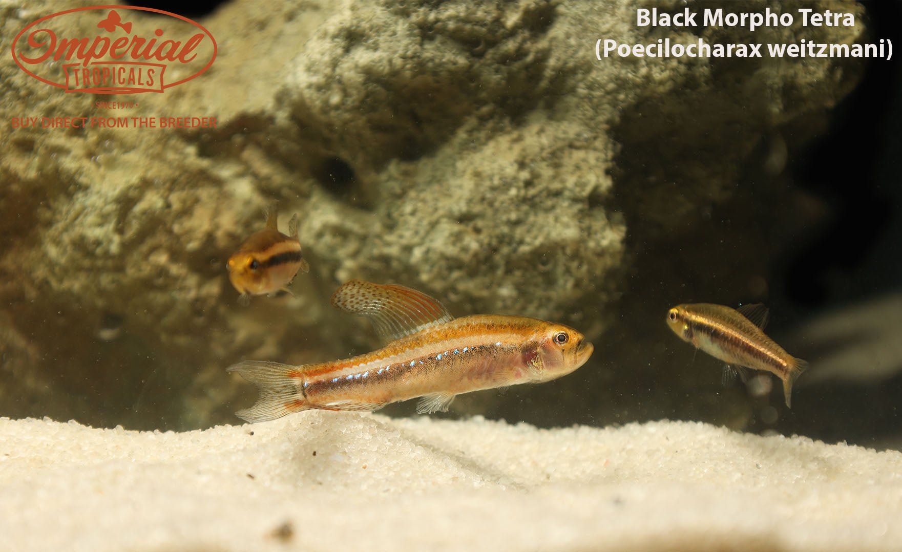 Remarks: Black Morpho Tetras (Poecilocharax weitzmani) are small tetras from Rio Orinoco and Rio Negro river basins in South America. Males exhibit striking red horizontal lines on their bodies, with a thick black line with blue speckles running inbetween. They also have impressive sail fins, which they will flash in order to attract females.