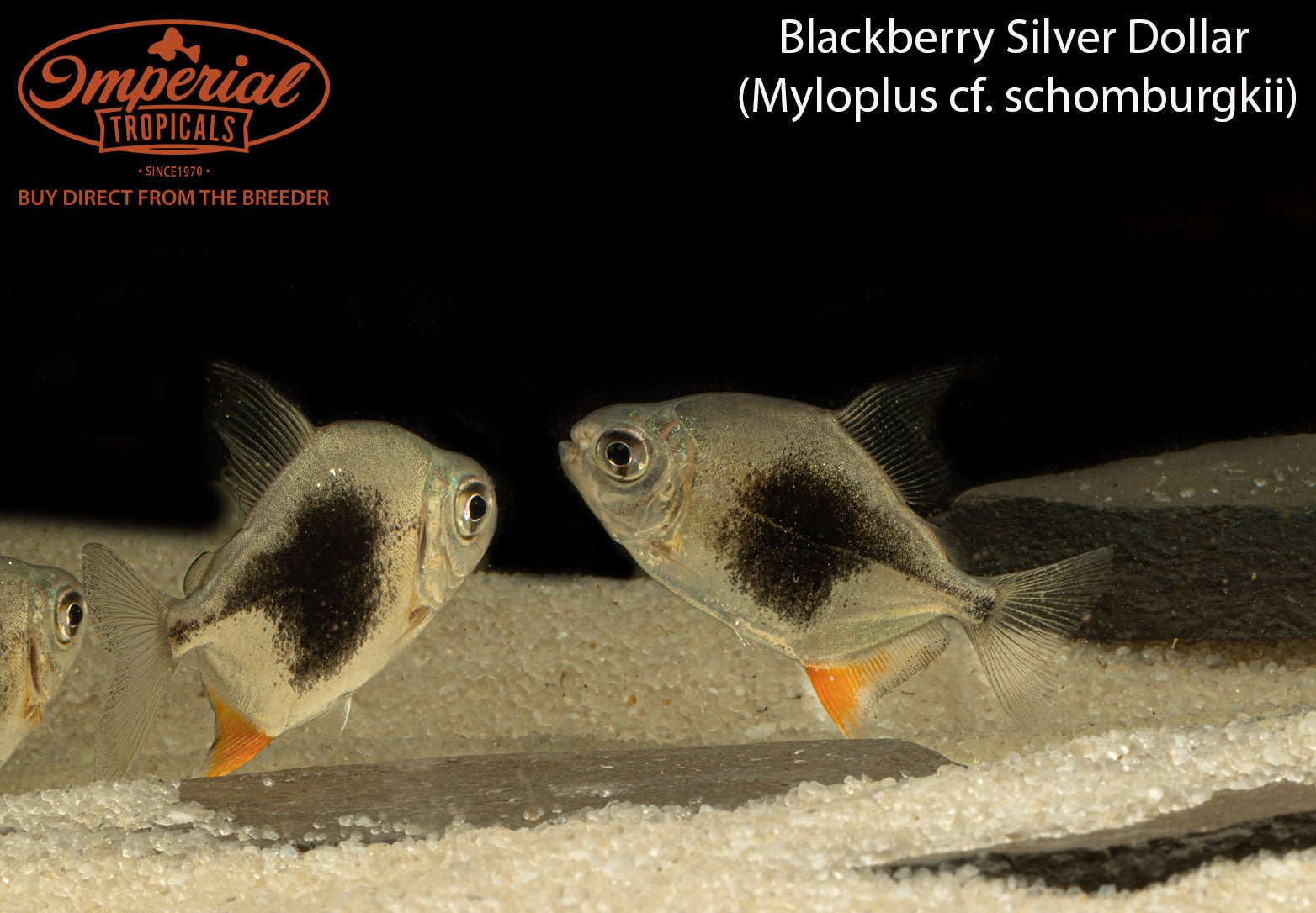Remarks: Blackberry Silver Dollar tend to eat plants in aquaria, so plastic plants or hardy plants like Java Fern or Anubias should be used. These fish have light blue bodies with distinct blueish-black blotch that covers most of their body. They have orange anal fins and they may exhibit orange cheeks as well.