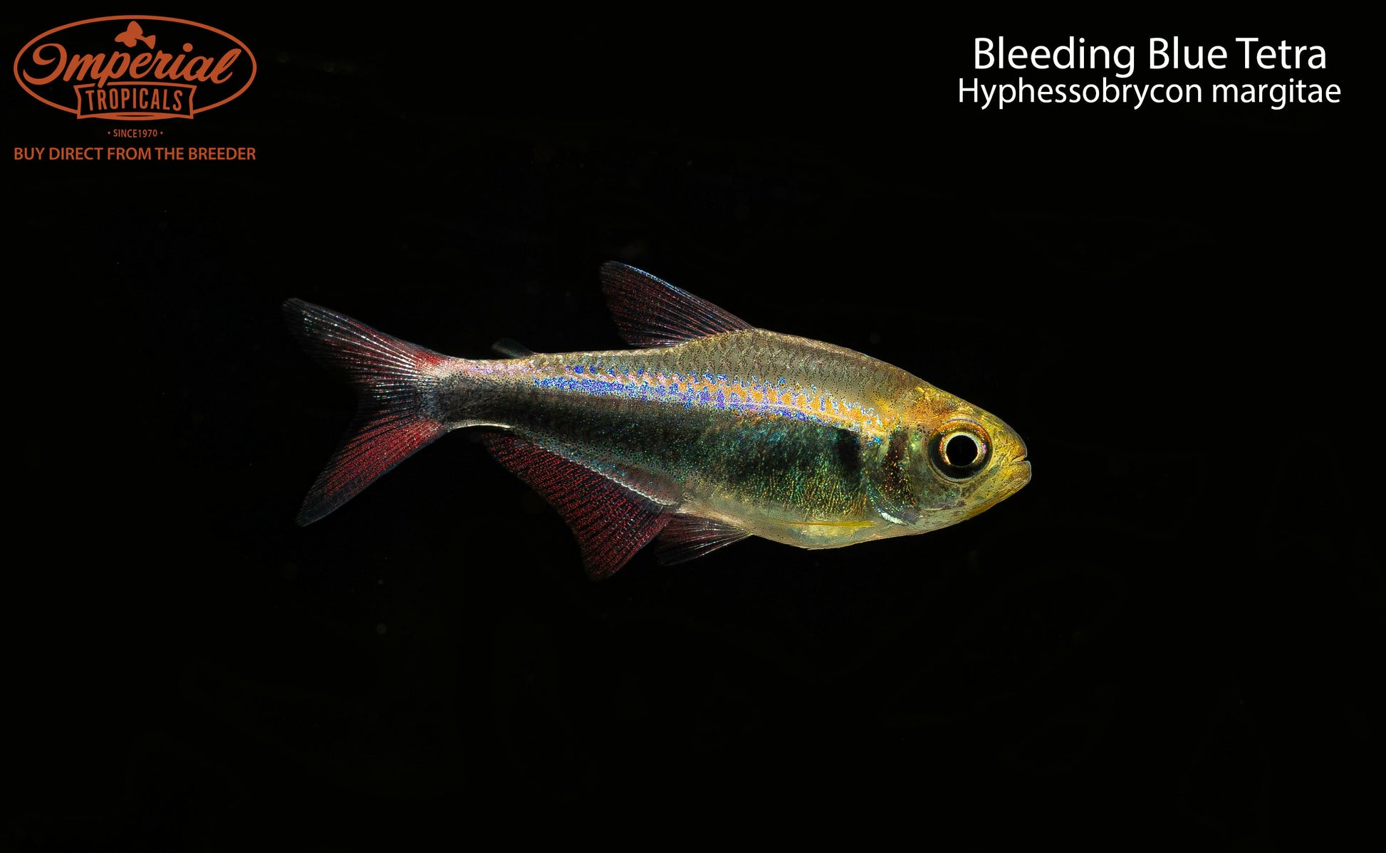 Remarks: The Bleeding Blue Tetra (Hyphessobrycon margitae) is a fairly new tetra, only being officially described in the late 2010's. These fish were formerly sold under the trade name H. sp. Red-Blue, and it is easy to see how they got their name! Both males and females have a thick iridescent blue bar along their stomach, much like Emperor Tetras. Males, more so than females, have bright red at the base of their unpaired fins, as if the fins were bleeding.