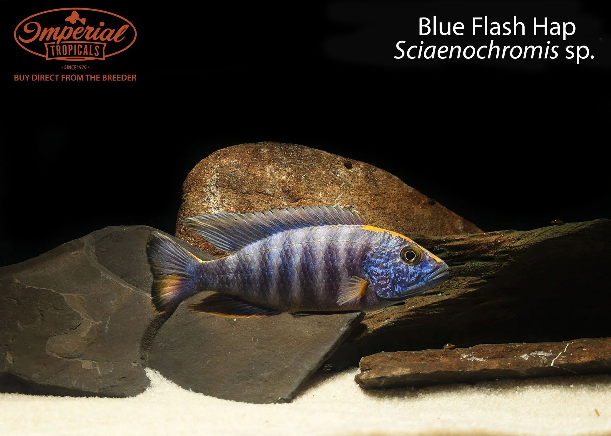 Remarks: The Blue Flash Hap is a off throw of the German line-bred variety of the Pink Flash and was created when we were breeding our Pink Flash and started seeing the blue offspring. We then separated out the babies showing the blue coloration and we are now line breeding the Blue Flash strain. There is a quite of bit of difference between the Blue Flash males, some with more blue, red, and yellow on the body. So if you are looking for something new to add to your all male peacock or hap tank, these would be a great choice!