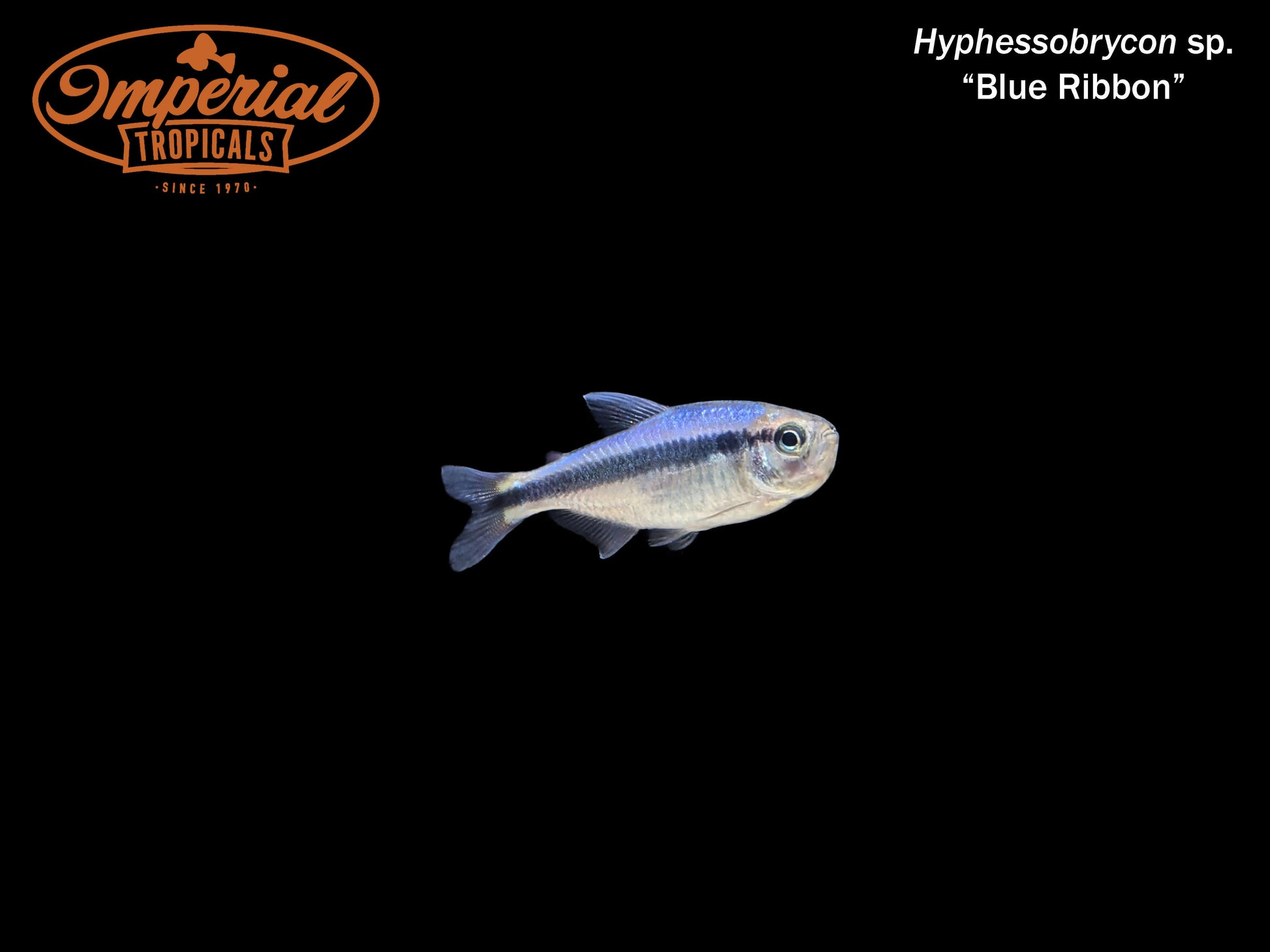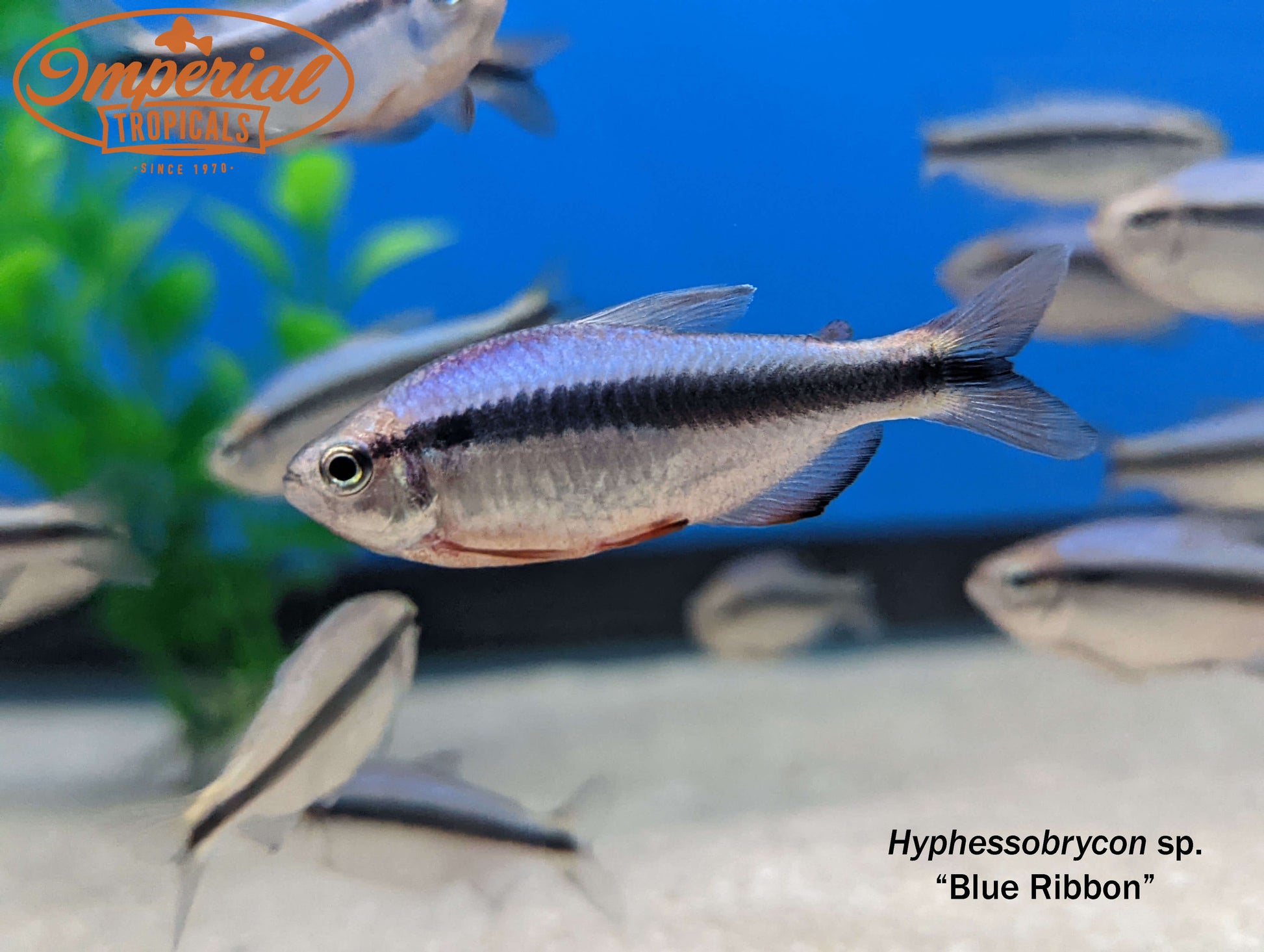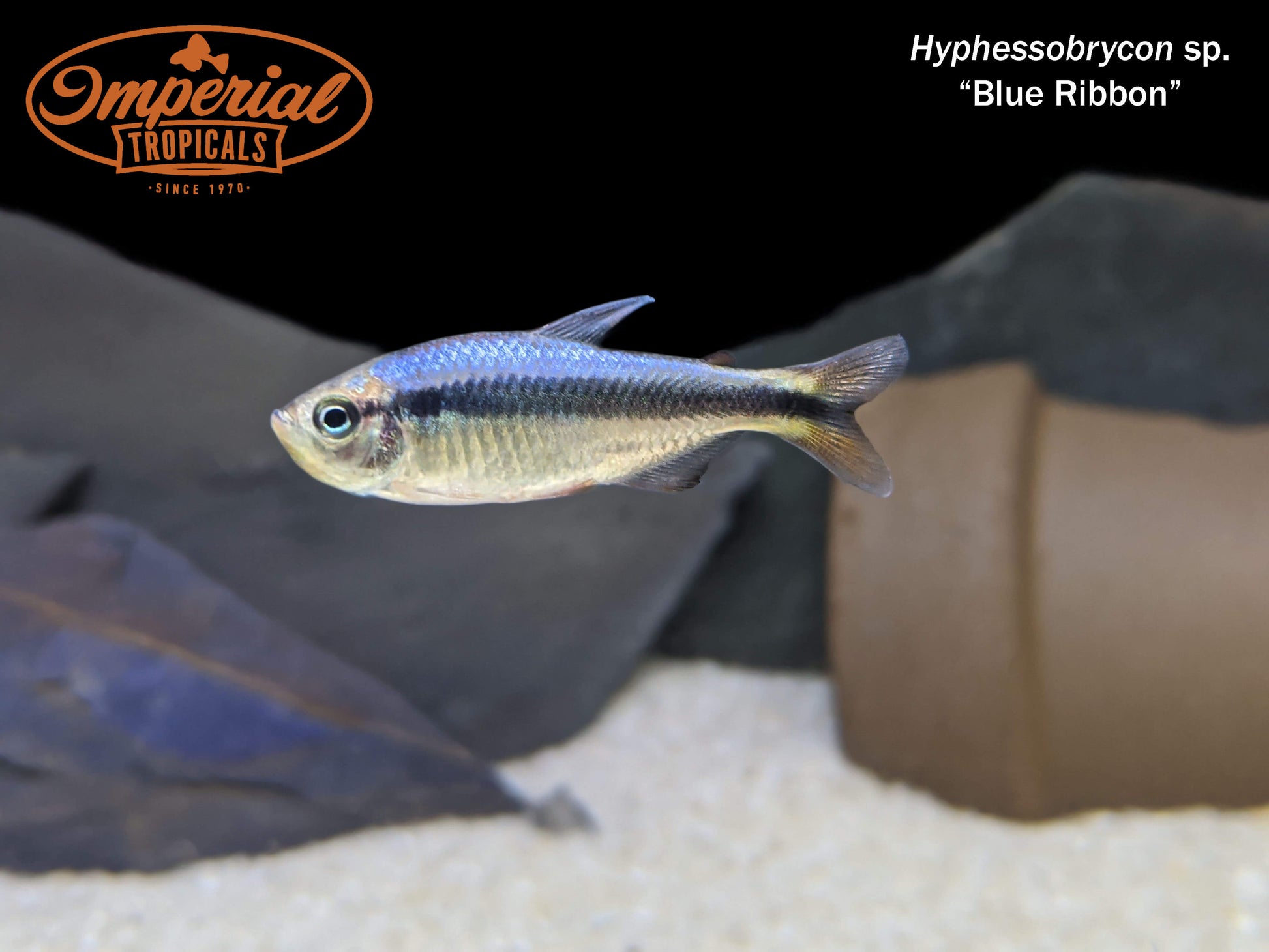 Remarks: Blue Ribbon Tetras (Hyphessobrycon sp.) are closely related to H. melanostichos, and are relatively new to the hobby. One of the main differences between the two fish are Blue Ribbon Tetras have a broader lateral line and lack any red in the caudal fin. This navy stripe is bordered by an iridescence that shines in many colors depending on the light angle, but you can clearly see the entire color spectrum of red, orange, yellow, green, and blue in this fish. It is truly a sight to behold.