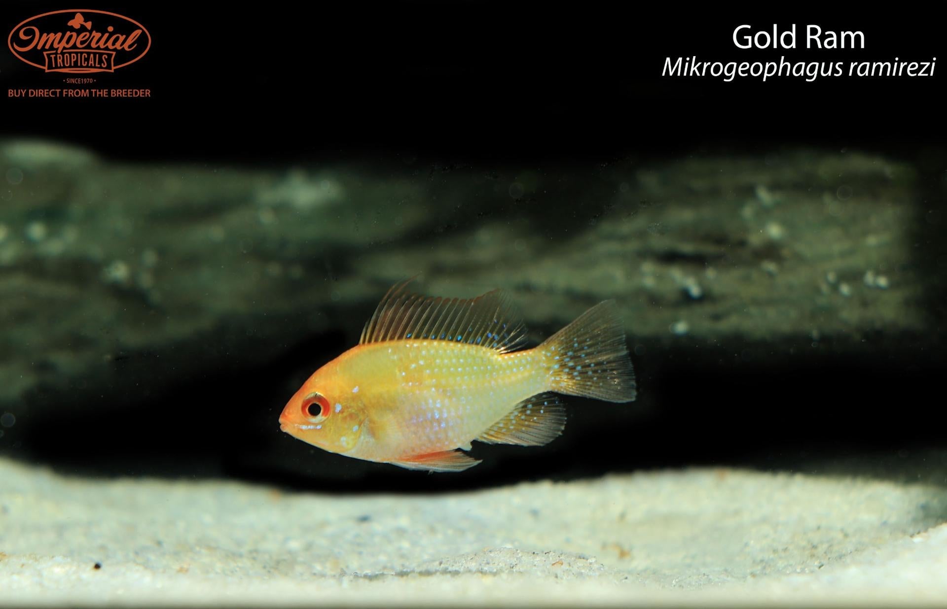 Remarks: Gold rams are a color variant of the popular German blue ram that has been bred to be an orange or gold color with no black markings. They still will get some blue scales, but they will be predominantly gold/orange.