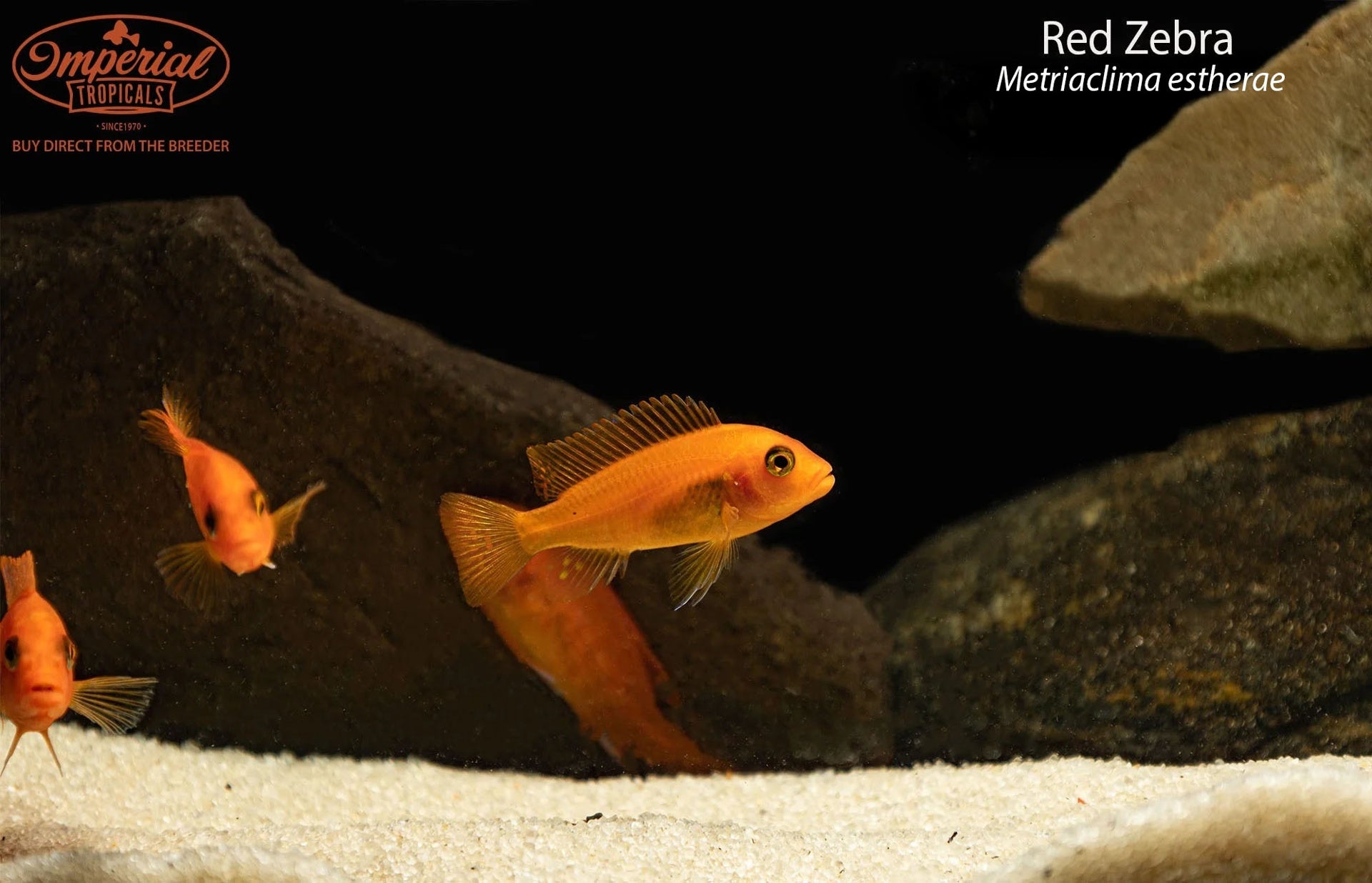 Remarks: The Red Zebra (Metriaclima estherae) can be yellow, orange, and even red. Some specimens may show stripes hence their name Red Zebra. In aquariums, most of these fish will be orange and show very little to no striping.
