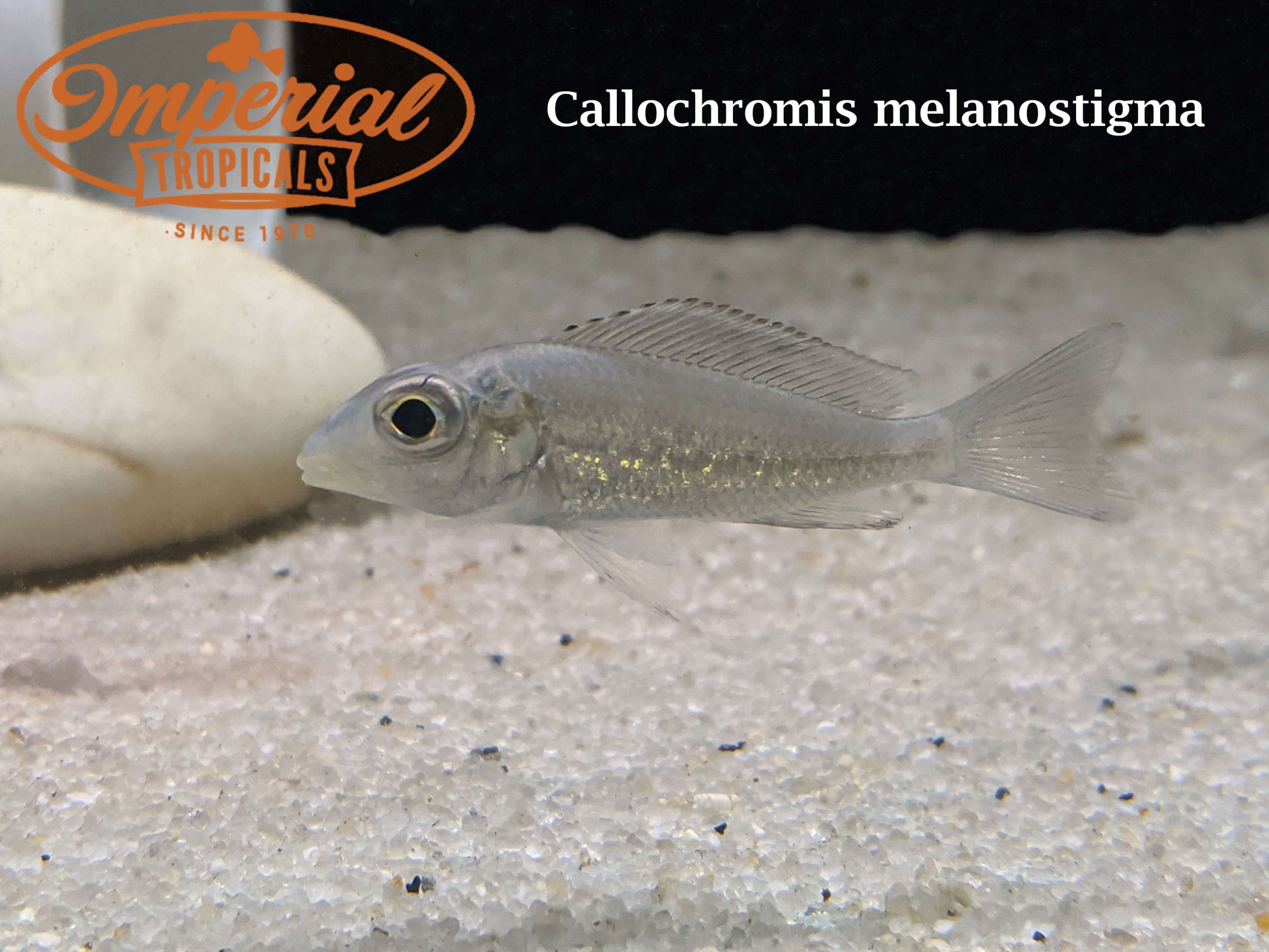 Remarks: Callochromis melanostigma are fascinating medium-sized Tanganyikan cichlids found in the southern end of the lake. They have a unique shape with their large eyes and tall dorsal fin that seems to end abruptly above where the ventral fins are located. The rounded front of the dorsal fin along with the small, darker colored spikes atop it gives an almost buzzsaw appearance. While females and juveniles are mostly gray, mature males display metallic gold colors on their bodies and fins that seem to shimmer in the light occasionally with a green sheen. Their dorsal fins also contain 4-5 black spots and their anal fins display yellow egg spots. The eyes of males can range anywhere from gold to orange. All these aspects come together to form a truly stunning fish for which pictures cannot do it justice.