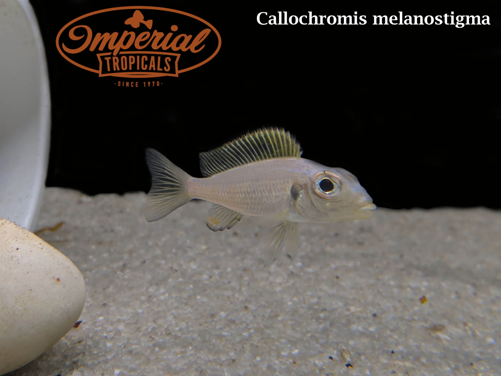 In the wild, Callochromis melanostigma can be found in shallow, sandy areas that sometimes will have patches of aquatic vegetation such as Vallisneria spiralis. They will use the sparse rock piles also found in these areas as shelter when young or when predators are present, otherwise they patrol the sandy expanses. Males build crater-nests in the open sand to attract mates which is a very fascinating behavior to witness within the aquarium. Spawning occurs in the crater, where females take the eggs into their mouths and mouthbrood for several weeks. To facilitate this behavior in captivity and allow for spawning, a large, open, sandy space is needed that is free of obstructions such as rocks or décor. Not providing enough territory space can result in heightened aggression toward both their own kind and other species. Sand is necessary, as they spend a considerable amount of time sifting it through their gills to feed. Being mostly carnivorous, foods high in protein such as bloodworms should be a staple, but foods containing vegetable matter and algae should also be offered to aid in digestion.