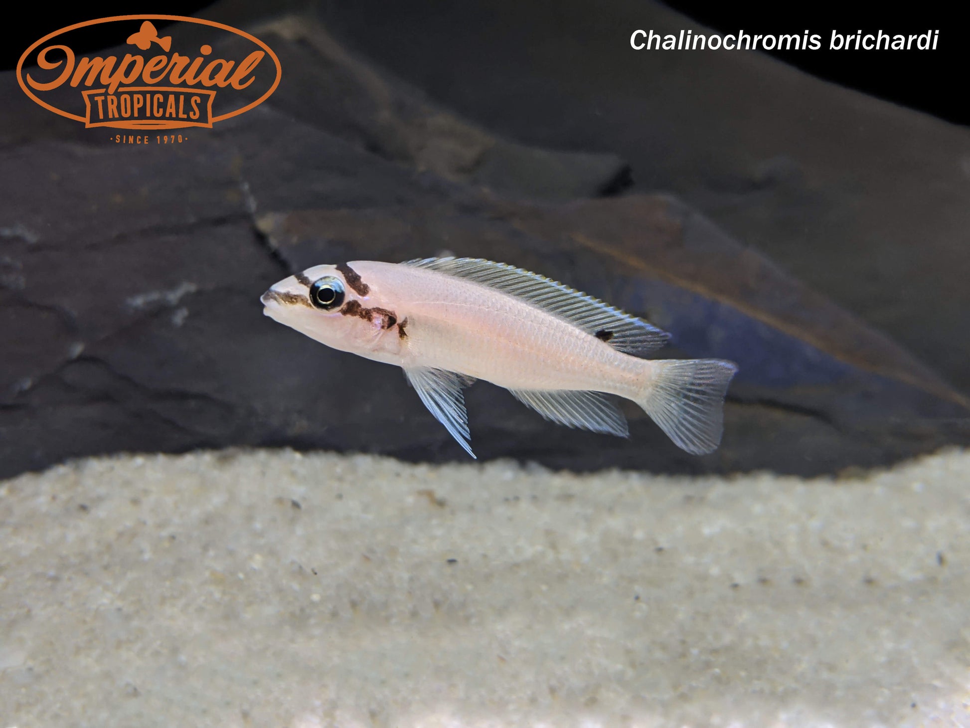 Remarks: Chalinochromis brichardi is a Tanganyikan cichlid with a predominantly white body. Like other Chalinochroms spp., they have bridle-like markings on the face (chalina in Greek translates to bridle). They can be distinguished from another popular species, C. sp. Ndobnoi, because they lose their juvenile spots as they age while C. sp. Ndobnoi retains them.