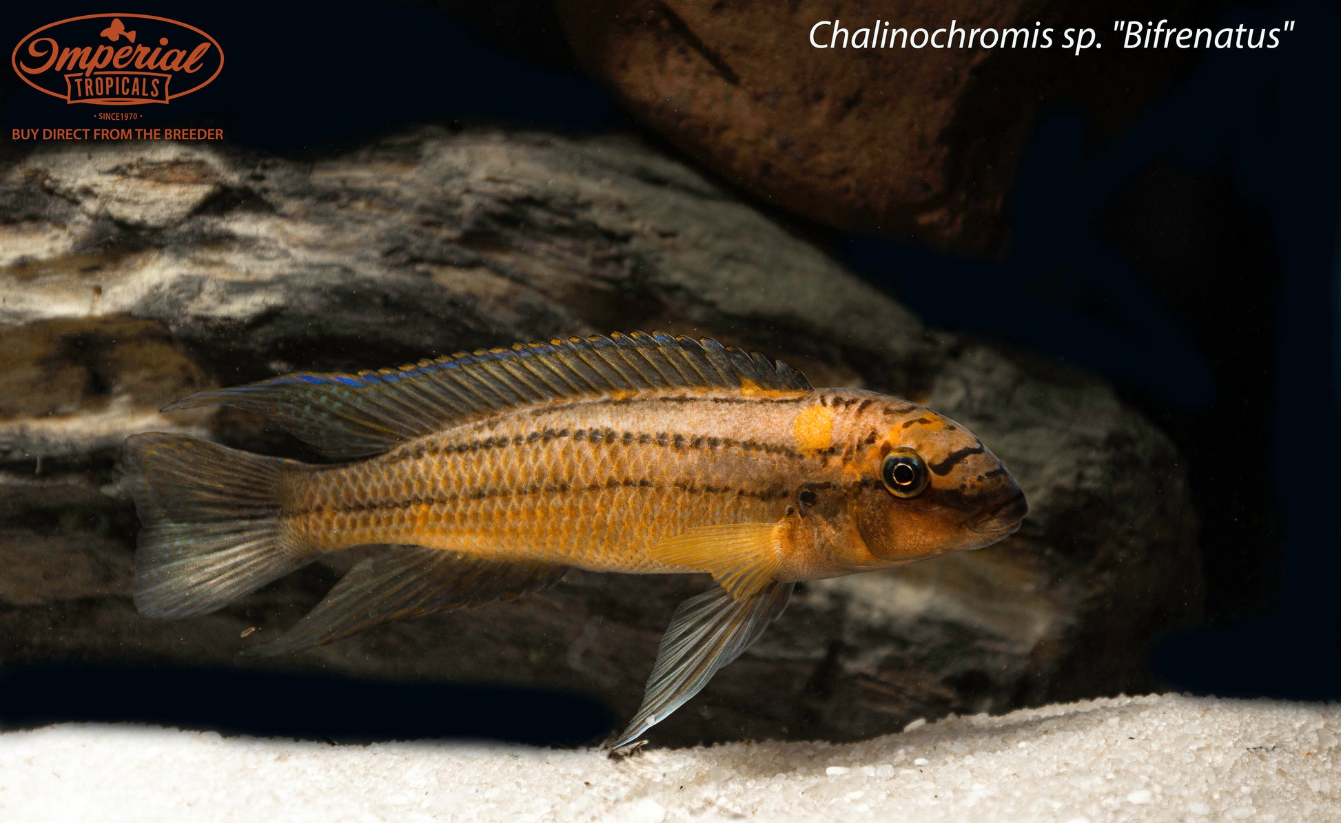 Remarks: Chalinochromis sp. "Bifrenatus" is a mid-sized Tanganyikan cichlid found hiding in rock piles and away from the sandy areas of the lake. Like other Chalinochroms spp., they have bridle-like markings on the face (chalina in Greek translates to bridle). What sets them apart from other species is that the markings continue down the length of their body in the form of two horizontal stripes along their lateral line rather than a series of dots.