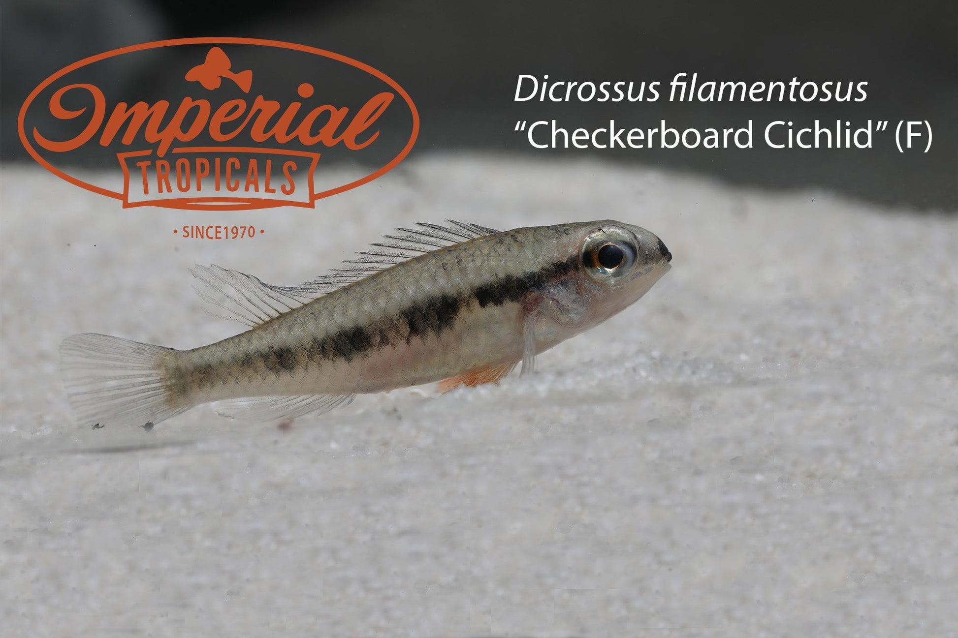 Remarks: Checkerboard Cichlids (Dicrossus filamentosus) prefer very soft and acidic conditions and require them to reproduce successfully. They are perfect for blackwater community tanks with sandy substrates, small characins acting as dithers, and plenty of cover in the form of plants, driftwood, and leaf litter. Males have longer, more colorful fins than females.