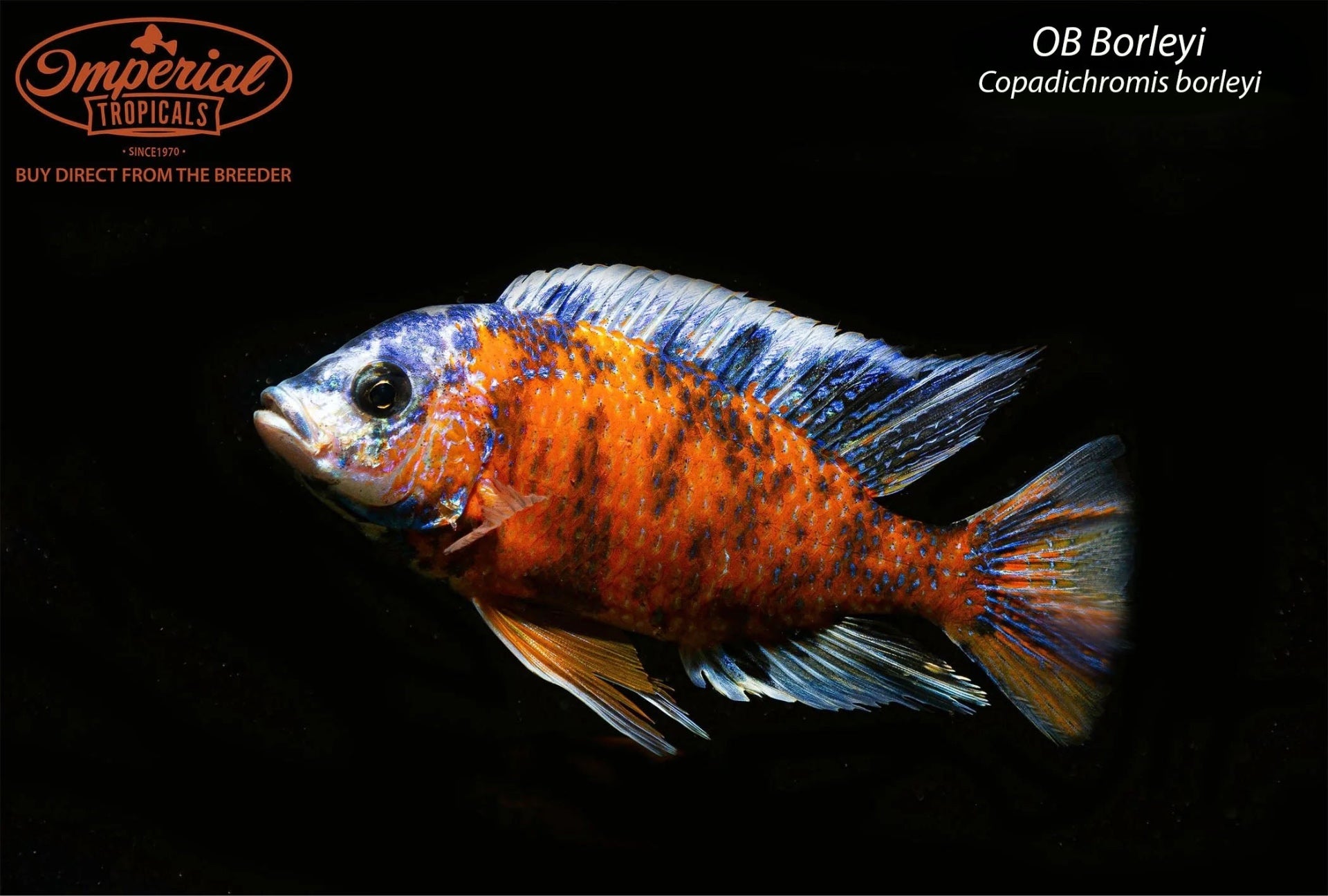 Remarks: The OB Borleyi is a hybrid of Copadichromis borleyi and a another species, most likely the OB Peacock, to produce a fish with the signature blotchy pattern of oranges, blues, whites, and blacks of OB hybrids. The amount of blotching and coloration varies between each fish so no two should ever look exactly alike.