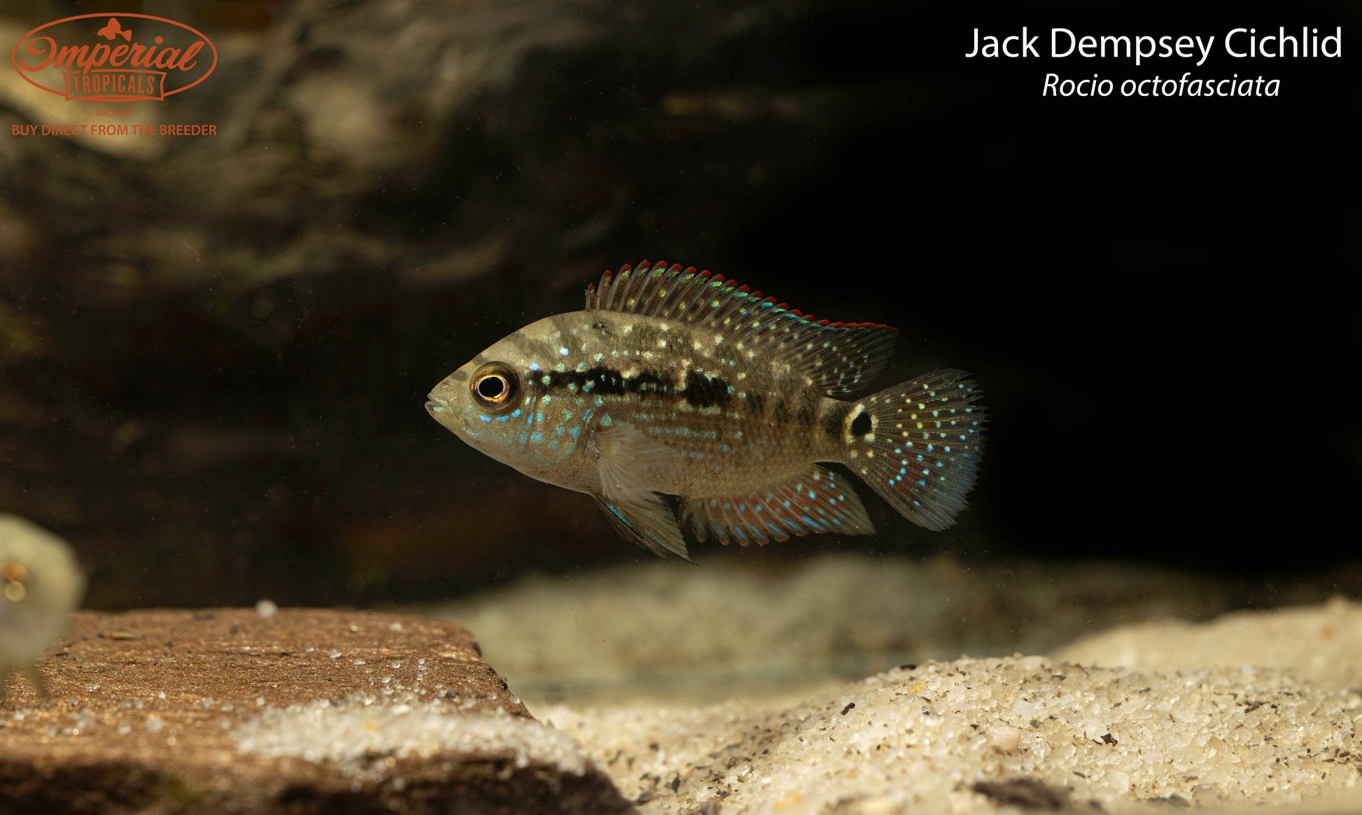 For many years Jack Dempsey cichlids have been a popular cichlid among aquarists due to how hardy they are, their impressive size, feisty nature, and bright colors. While juveniles only have a few metallic blue scales, they tend to get more and more as they age until it covers a large majority of their body and fins as long as they are healthy. Females will have less of these dazzling scales with some males being almost completely covered in them. The Jack Dempsey's common name comes from an American heavyweight boxer of the same name that was well known back in the 1920s. Aquarists at this time thought the strong, defined jaw and aggressive nature resembled the boxer and the name has stuck even to this day.