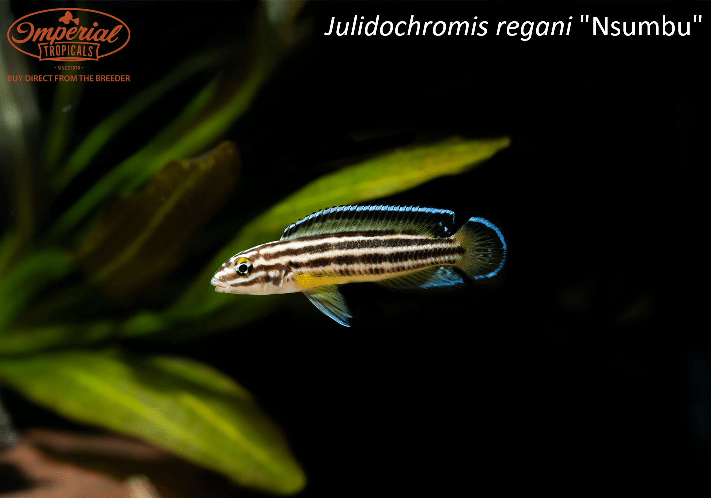Remarks: Julidochromis regani "Nsumbu" is one of the many localities of Julidochromis regani in the hobby. They are known from the shallower, southern sections of the lake. Unlike most other localities, they have very little to no patterning in their fins though they will still display, blue, black, and yellow coloration in them. They also have yellow bordering their mostly silver bodies beneath their four black stripes.