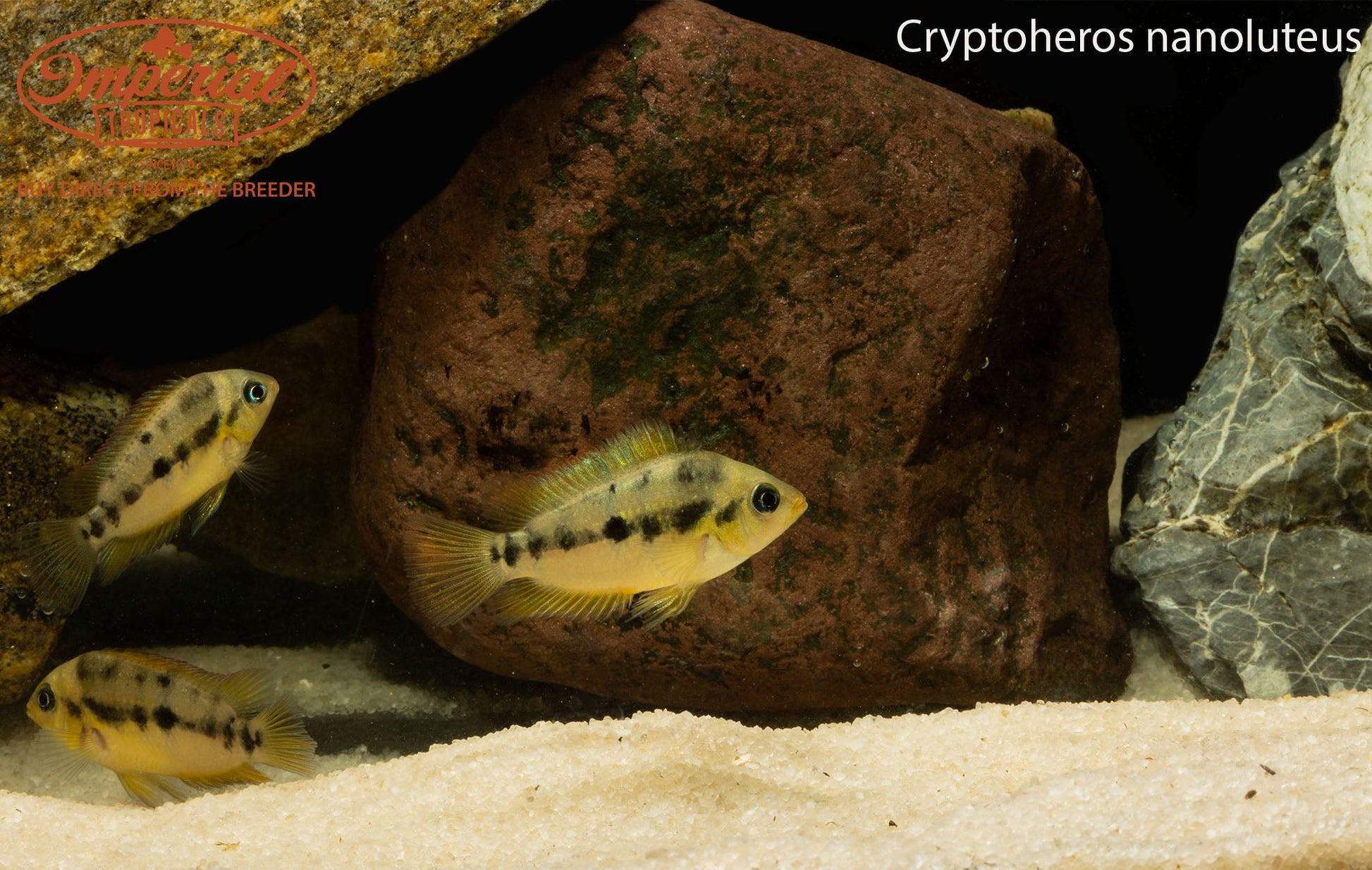 Remarks: Cryptoheros nanoluteus is an endangered species and is on the CARES list. This fish is from Central America and will typically do well with fish that have a less aggressive temperament. They are bright yellow fish and are sometimes referred as Yellow Convicts. Since this fish is endangered we highly recommend hobbyists try to breed them at home. Sexing this fish is easy: Mature males will grow larger and can form a small hump, and females will have a distinctive black circle in the middle of the dorsal fin. Do not keep these fish with other Cryptoheros to avoid hybridization.