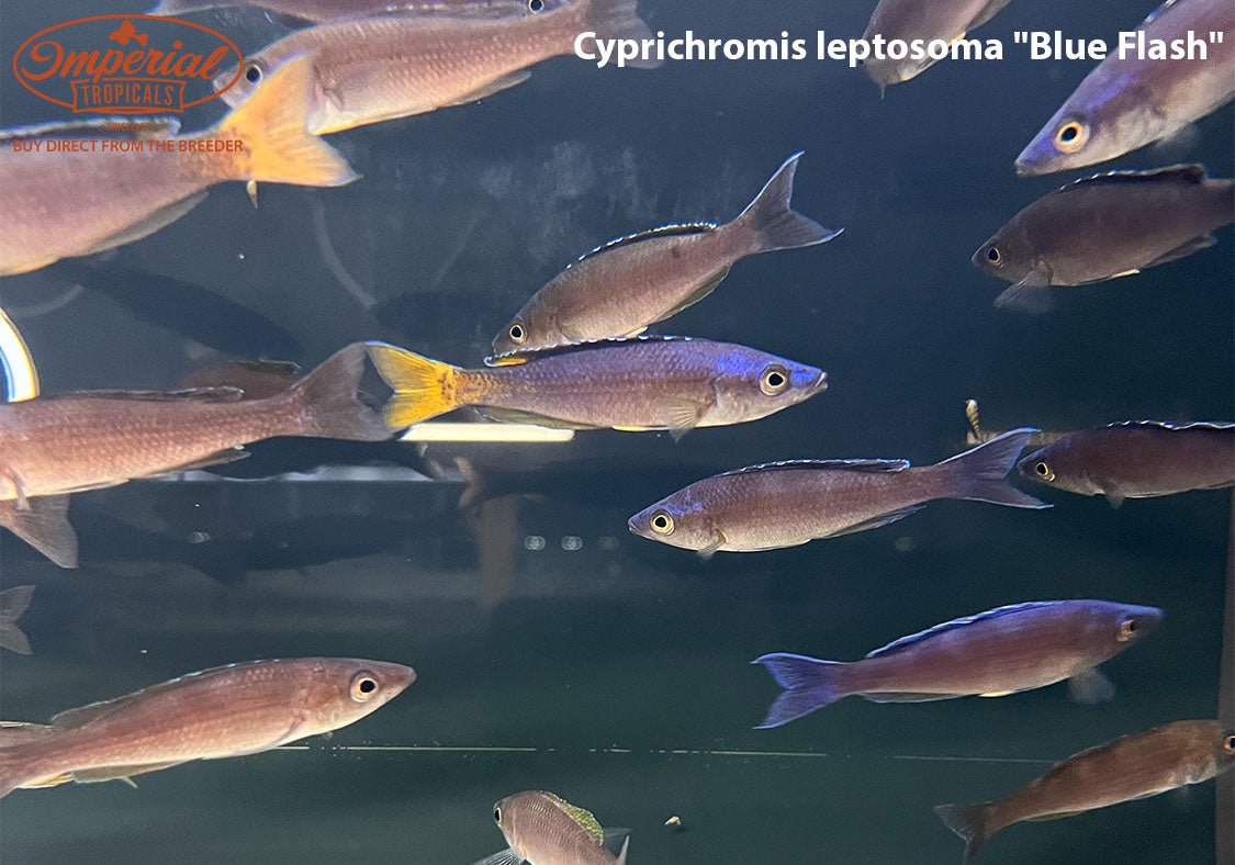 Remarks: Cyprichromis leptosoma "Blue Flash" are a beautiful species of Cyprichromis with males showing electric blue coloration on their bodies and bright yellow on the fins. When not displaying, they tend to be more of a silver color like the females.