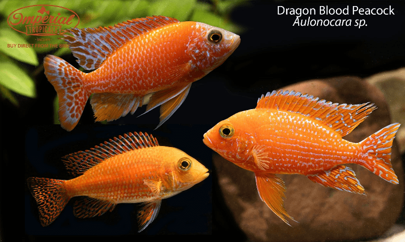 Remarks: The dragon blood peacock, or fire fish, is a hybrid, but its origins are unknown. They show a remarkable variation in color and pattern with the German strain we currently breed typically being a more pinkish-orange color. Please note that males under 4" may not show much color, but they typically develop a tremendous amount once they settle into their permanent tank. Some fish will have spots as well, which likely came about from breeding at some point. We cannot guarantee the density of spots, though the fish labeled as "Black Spots" will have a higher density. Some normal males or females will contain spots.