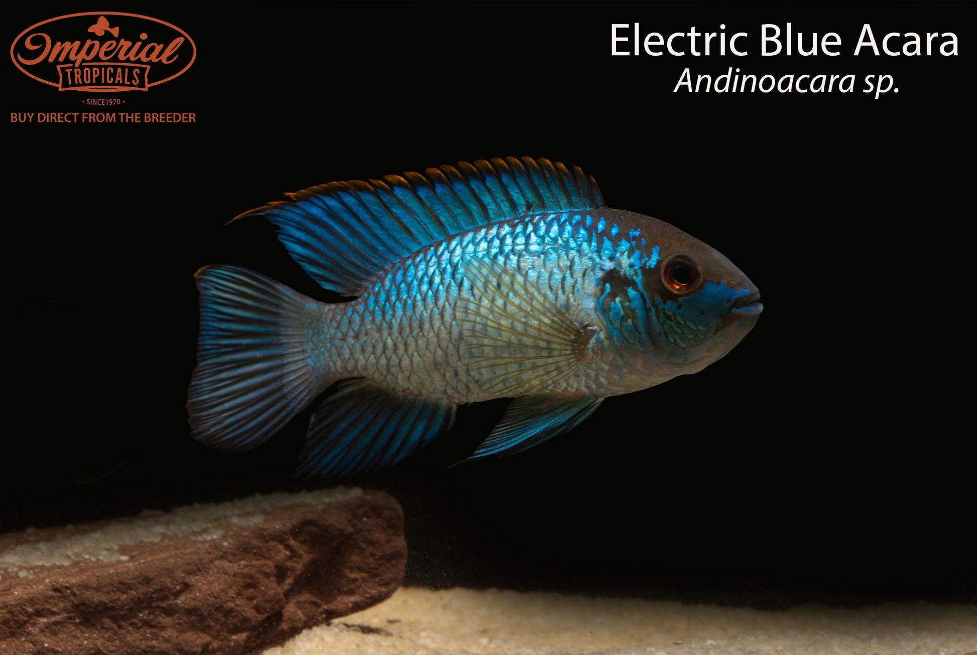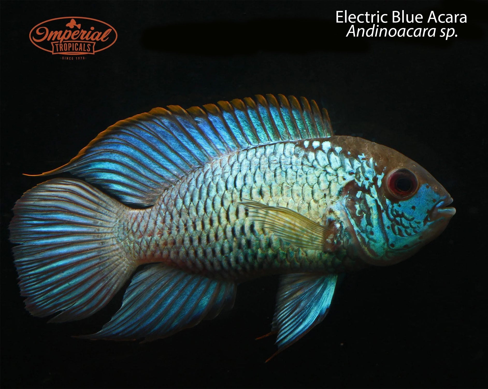 These bright blue fish are fairly peaceful unless spawning and can be kept with similarly sized South American cichlids, such as Geophagus, Severums, and Angelfish. Due to having been bred in captivity for many many years, they are very hardy and put up with a fairly wide range of water parameters but still should not be kept with African cichlids. Care should be taken, however, to not house them with fish small enough to fit in their mouth as they may eat them. Sometimes electric blue acaras may nibble plants, but majority of the time they leave them alone and prove to be a beautiful addition to South American tanks with or without plants.
