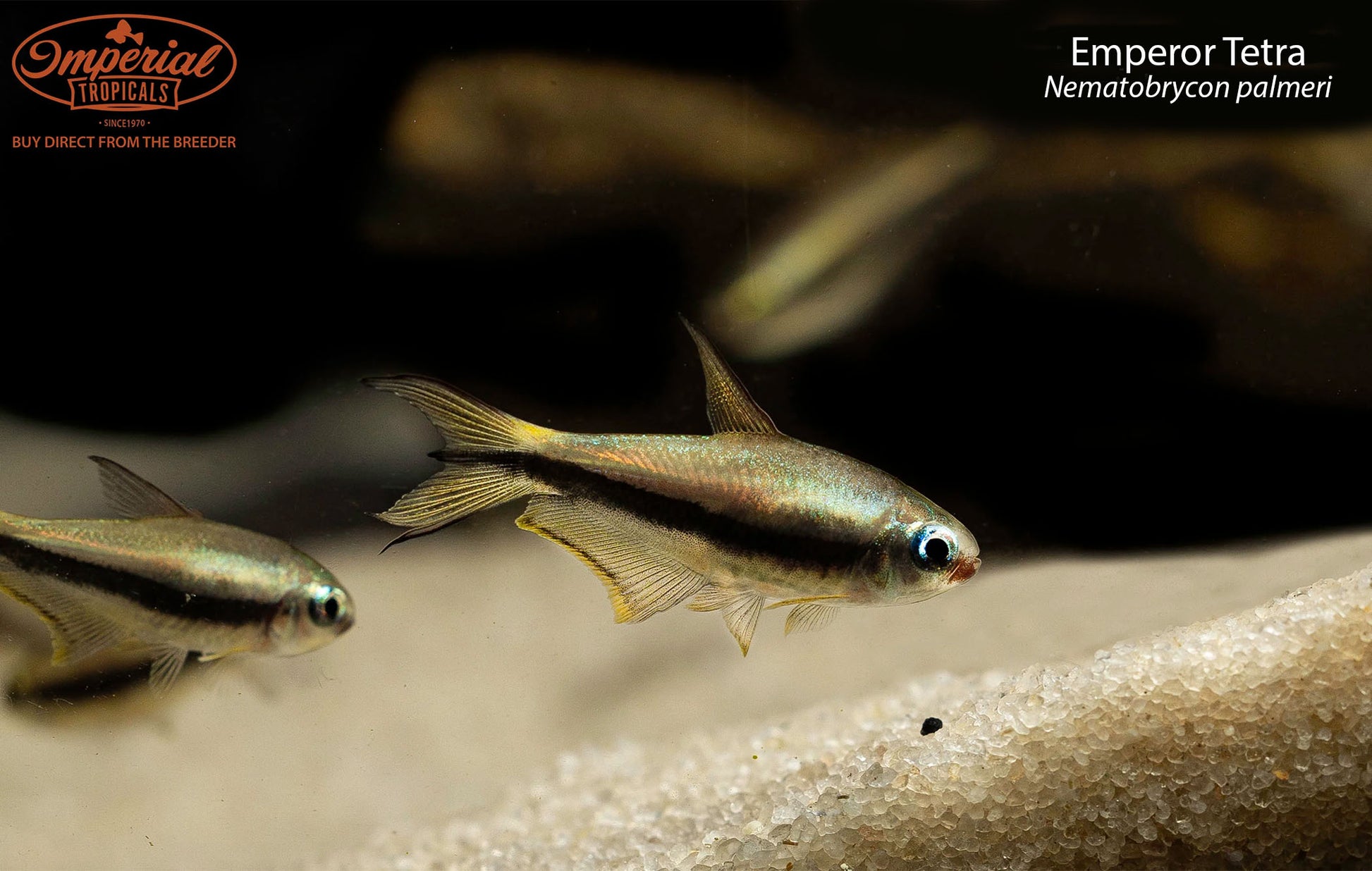 Remarks: Emperor Tetras can be a great community fish due to their medium size, stunning colors, and sexual dimorphism. Both genders have silver bodies and a thick black band in their lower half and a thick black stripe in the center of their caudal fin. Males turn a slight purple color and gain an iridescence along their body that shines in a rainbow of colors as the light bounces off. The anal, dorsal, and caudal fins in males have extensions as well as orange trim on the edges. Sometimes sparring among males can get violent so when keeping multiple males in one tank, provide plenty of breaks in the line of sight through the use of live plants or other decor and to spread out aggression by keeping them in groups of 8 or more. Emperor tetras also tend to be very active for their size so it is best to keep them in tank 40 gallons or larger.
