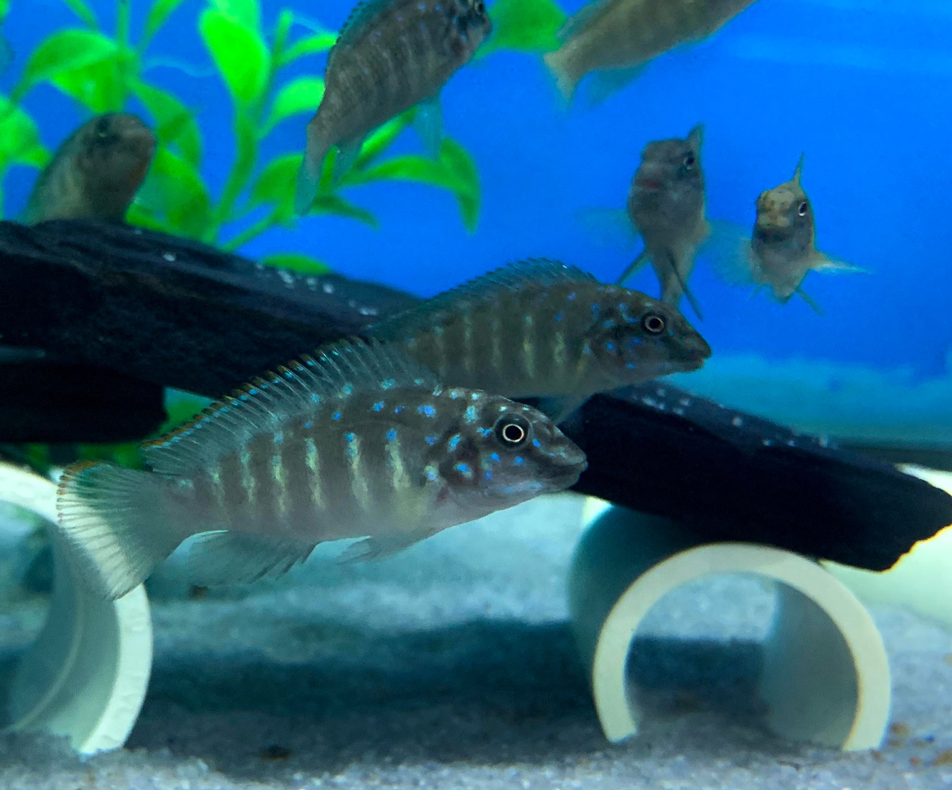 Remarks: The striped goby cichlid is the type species for the genus Eretmodus who are commonly referred to as goby cichlids. While these fish may be small, they have huge personalities and display some amazing colors. Juvenile and stressed striped goby cichlids tend to be gray or light tan while settled adults have a much darker coloration sporting a gray or dark brown base with yellow or tan vertical stripes. Both juveniles and adults display the most striking coloration seen on these fish, iridescent electric blue spots on the face and down the back. These spots are reminiscent of juvenile Tropheus duboisi but unlike the Tropheus, these spots are present for the entirety of the striped goby cichlid's life.