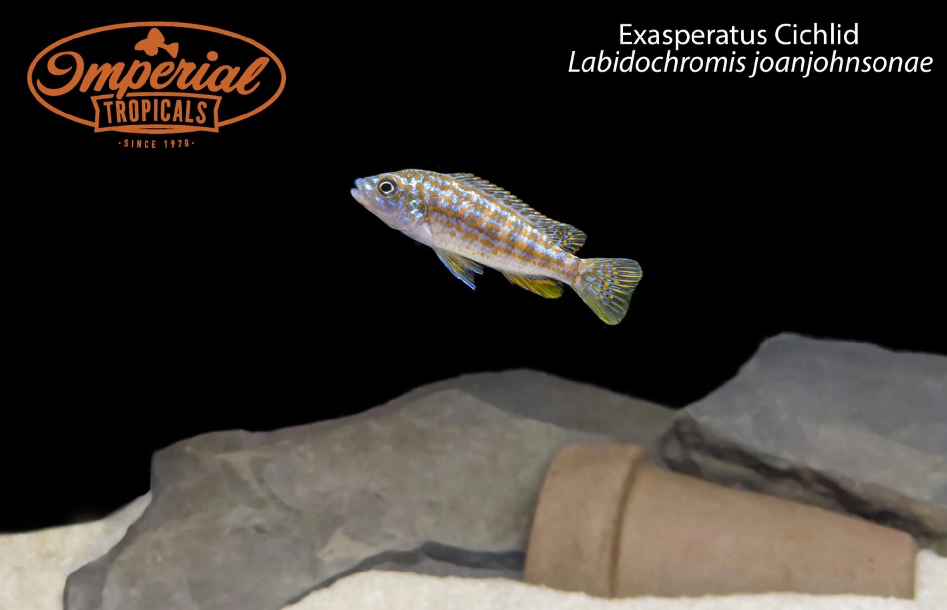 Remarks: The Exasperatus (Labidochromis joanjohnsonae, formerly Melanochromis joanjohnsonae) is a speckled mbuna when young, but males turn blue with black fins. Juveniles have yellow stripes, but adult fish are mostly light blue with pale bands. Females typically do not act aggressively, but males can be aggressive towards fish with a similar appearance.