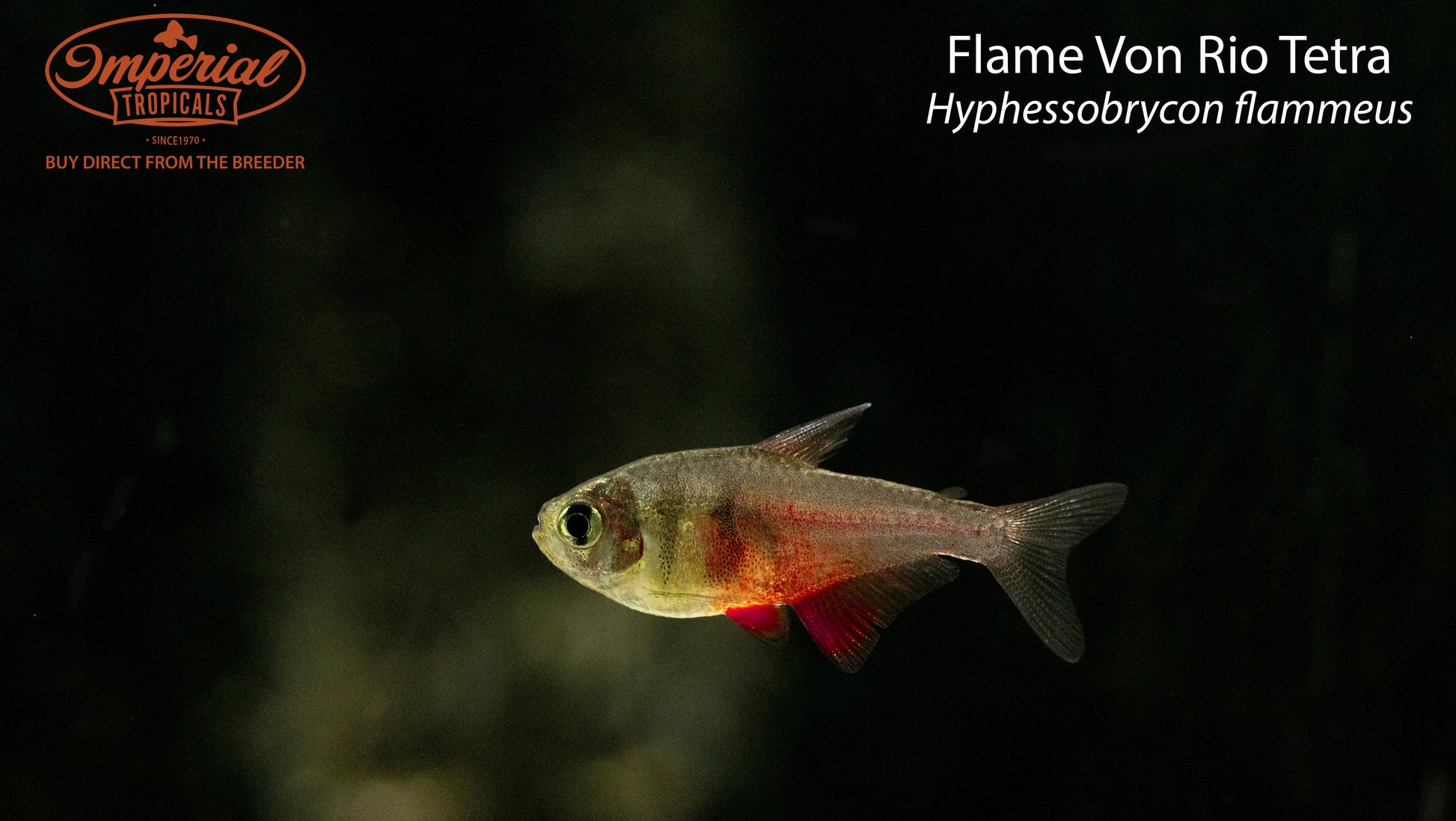 Remarks: The flame von rio tetra has been a popular staple in the hobby since the 1900s. These small tetras, only rarely exceeding an inch in length, pack a lot of color for their size with vibrant reds, yellows, and oranges throughout their bodies and fins. Males will display these colors at a higher intensity compared to females who are usually slightly duller and have more rounded bodies. These bright colors are reminiscent of fire and are accented by 2-3 black vertical bars starting just behind the gill plate. This coloration makes them stand out beautifully against live green plants. Some have been bred to have much more intense or different coloration such as orange, albino, diamond, and golden.