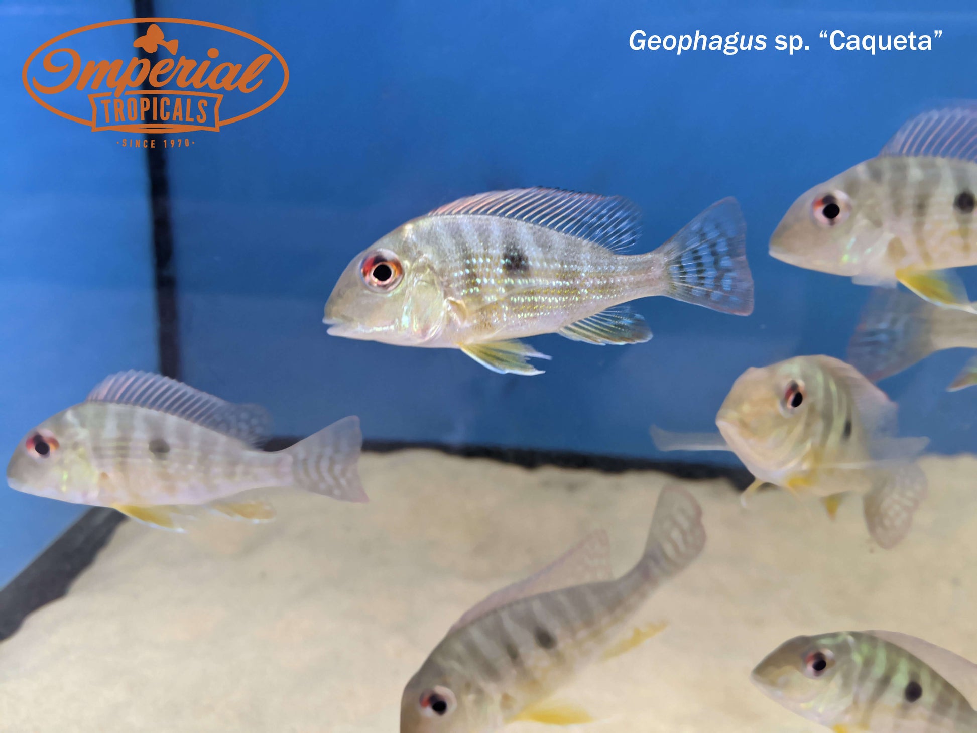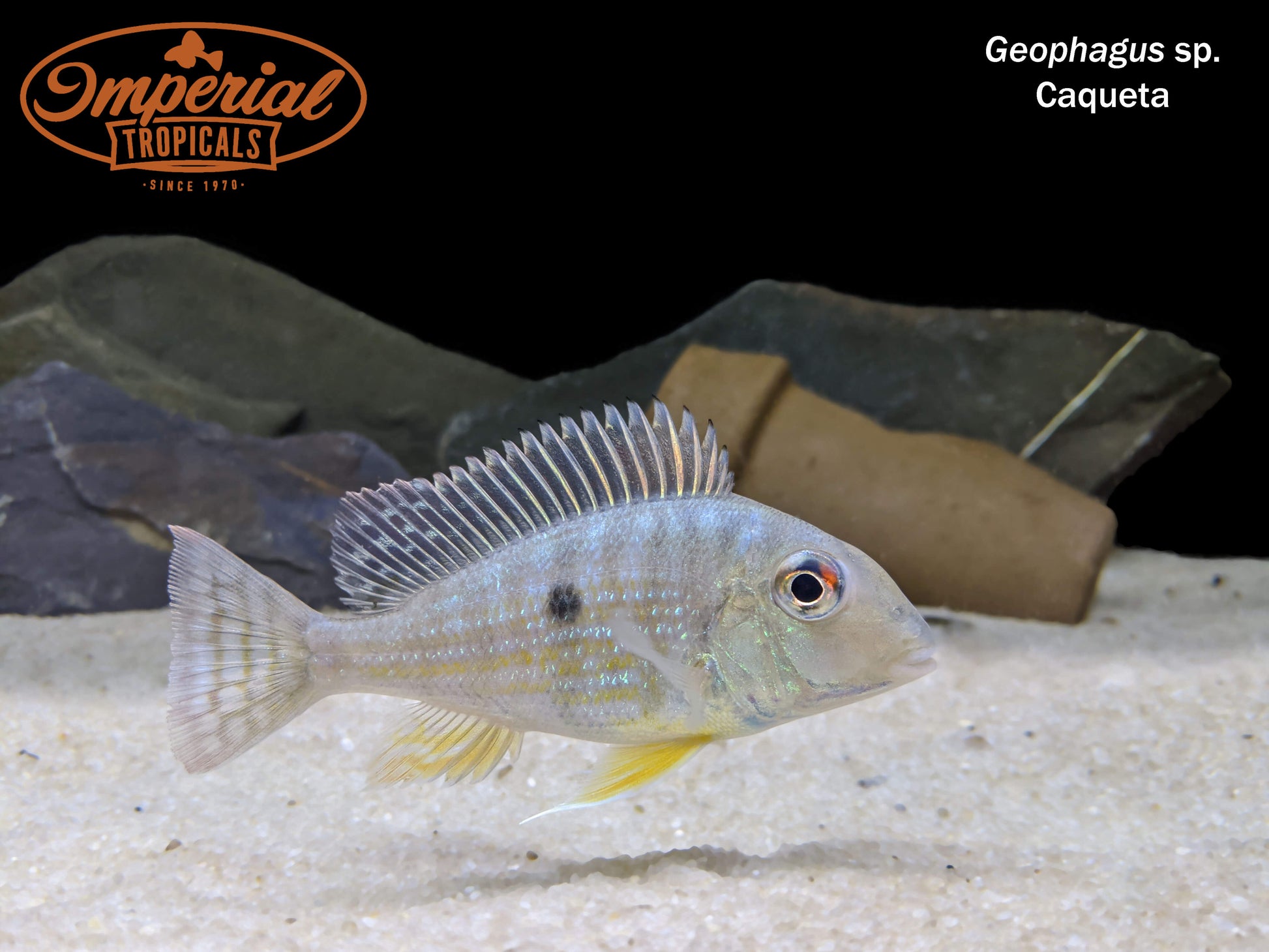 Remarks: A sandy substrate is necessary for all Geophagus due to their earth-eating habits. Geophagus sp. Caqueta is a Colombian species found in the Rio Caqueta. They are a golden color with faint tiger stripes and a dark spot around the third stress bar. They are similar in appearance to G. abalios but have more stripes and yellow fins, rather than red.