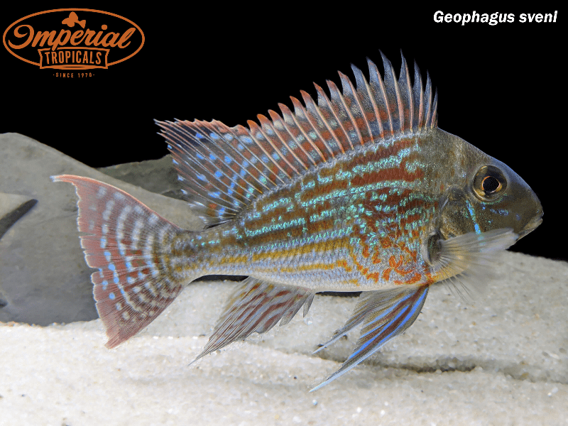 Remarks: Geophagus sveni are a large earth-eating cichlid from Brazil. Their bright blue and red stripes and long, filamentous fin extensions make them one of the prettiest species of Geophagus. Despite their size, they tend to be very peaceful for a cichlid unless a pair is spawning. When two have paired off, they tend to become territorial as they are usually very protective parents. It can be quite a sight watching the parents tend to a swarm of tiny fry. The best way to get a pair would be to purchase at least six fish and allow them to pair off naturally as it can be difficult to sex most Geophagus. Typically you won't even need to separate the pairs once they form as these fish do well being kept both in pairs and in groups of 5 or more as long as the tank is big enough.
