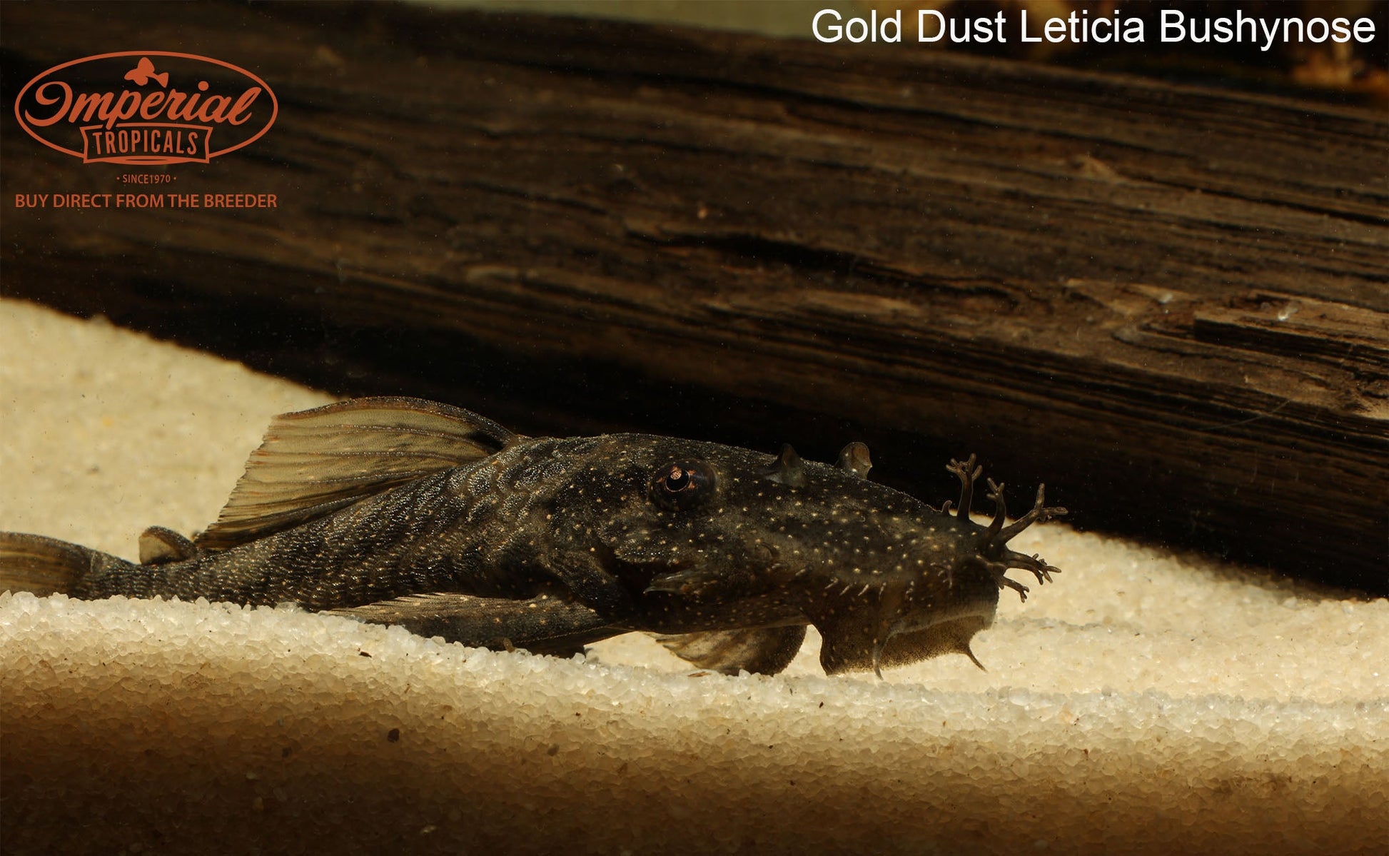 Remarks: Gold dust Leticia bushynose are a mottled brown and black in color with their body and fins covered in fine gold spots that add an almost sparkling effect. While this Colombian native is an Ancistrus species that has yet to be described, it is not the same as the common bushynose most typically see within the hobby and are in fact much more uncommon. That being said, their care is the same albeit they are more picky with their water parameters.