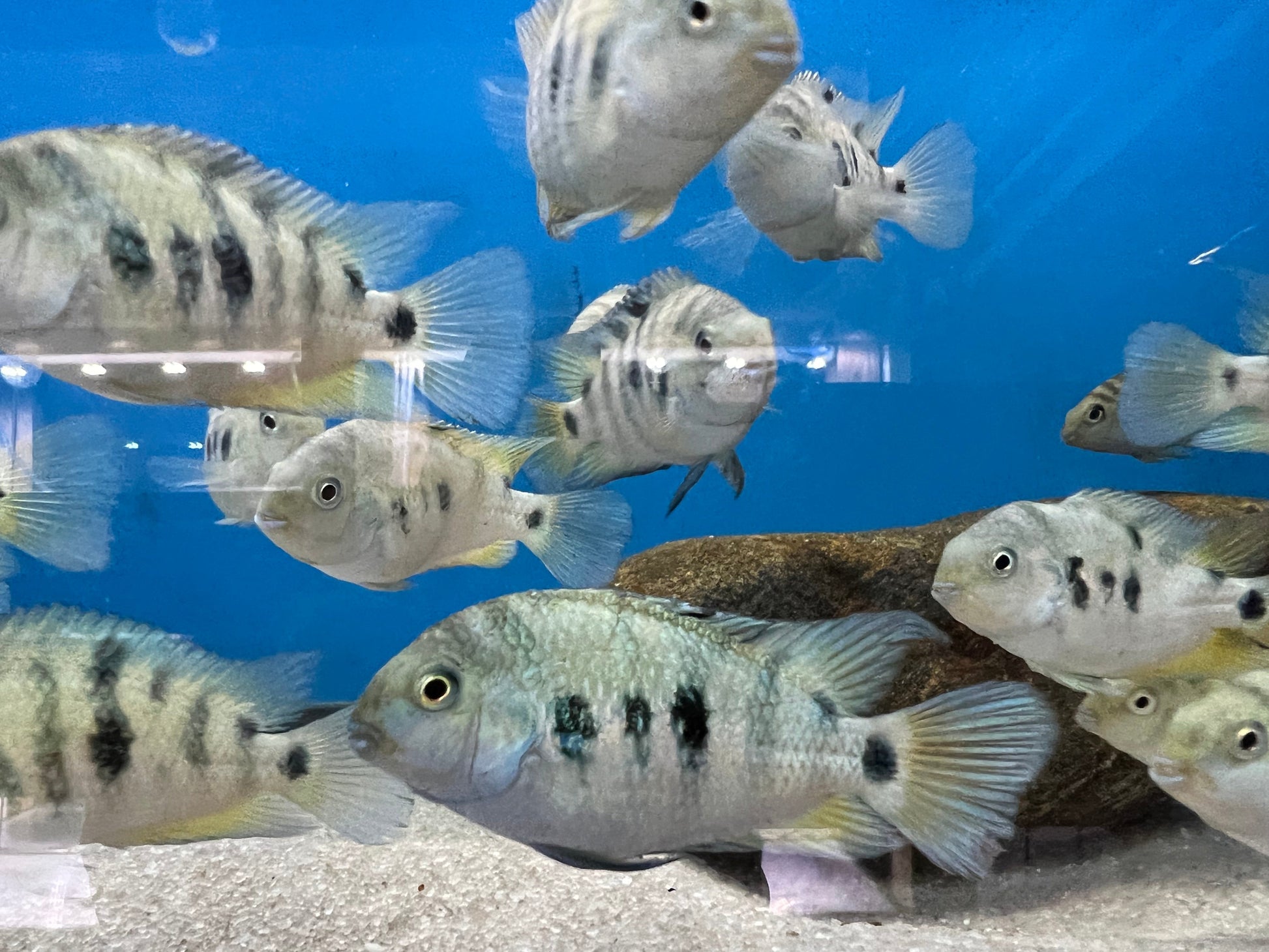 Remarks: Honduran Red Points are a close cousin of the popular Convict Cichlid. They have bright red-orange fins and the familiar body pattern of Convicts - blue-green with dark bars or spots, depending on mood. They remain small for a Central American cichlid and can easily be kept as a pair in a 30 gallon aquarium. Like Convicts, they produce many offspring and provide excellent care for them. However, they are considered less aggressive than Convicts, which allows for more flexibility with tankmates.