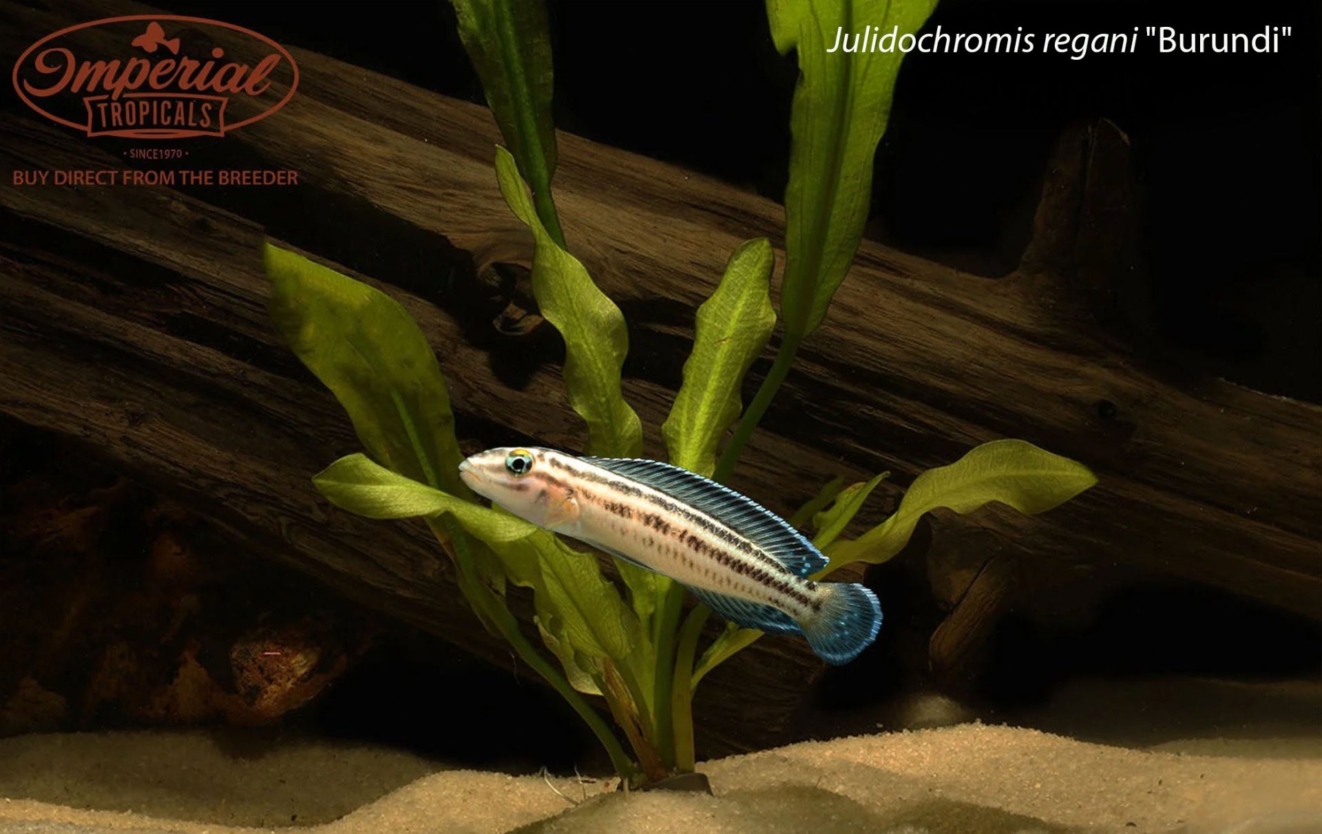 Julidochromis regani, also known as Regan's Julie, are one of the largest Julidochromis species that are found almost all throughout Lake Tanganyika. Like all Julidochromis, this species sports a torpedo-shaped body and a fairly small mouth. There are a number of localities available in the hobby whose colors can range anywhere from golden yellow to almost completely black. The base Julidochromis regani displays multiple horizontal black stripes against a white or yellow base along the entire length of their body all the way up to their mouths. Occasionally they will get blue accents in their ornately patterned fins adding extra color to an already beautiful fish.