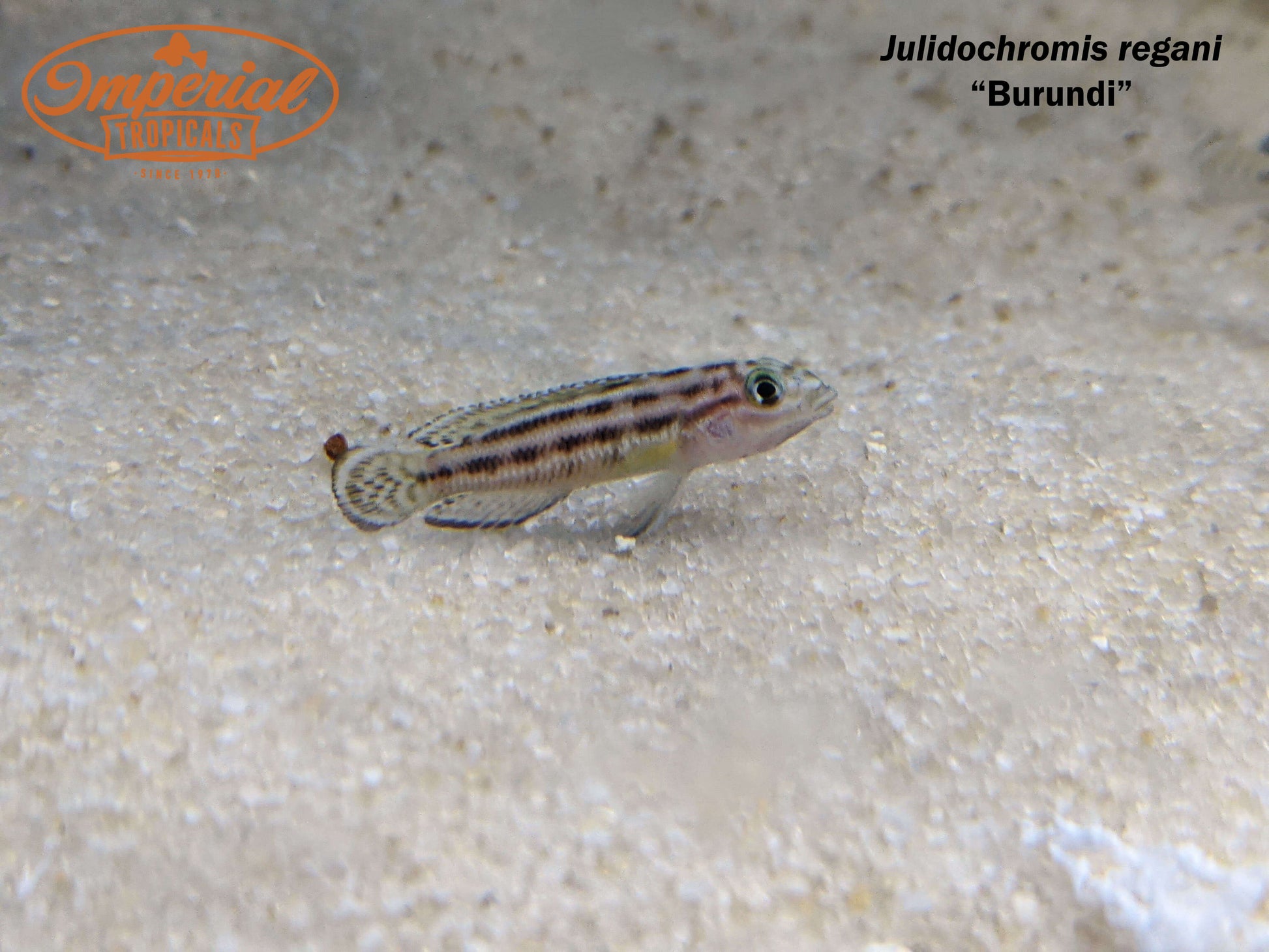 Remarks: Julidochromis regani "Burundi" is one of the many localities of Julidochromis regani in the hobby. They are known from the northeastern sections of the lake. They have mostly cream colored bodies beneath 4 black stripes. Typically their fins show blue and black coloration with little pattern.