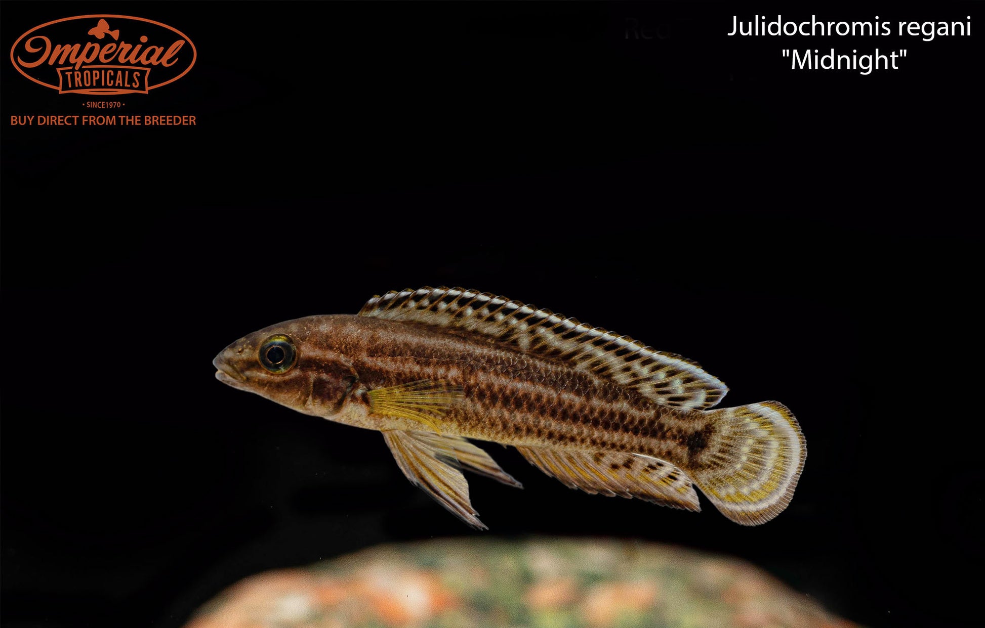 Remarks: Julidochromis regani "Midnight" is one of the many localities of Julidochromis regani in the hobby. These fish have dark brown or tan bodies beneath their black stripes with males turning almost completely black when courting females or sparring. When their blue and yellow accents come through, they can look stunning against such a dark fish. They are known from the deeper sections of the lake where this darker coloration helps them blend in.