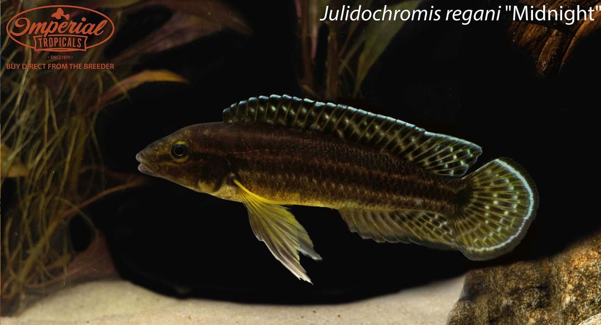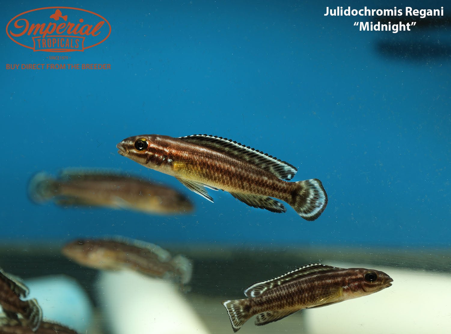 Julidochromis regani, also known as Regan's Julie, are one of the largest Julidochromis species that are found almost all throughout Lake Tanganyika. Like all Julidochromis, this species sports a torpedo-shaped body and a fairly small mouth. There are a number of localities available in the hobby whose colors can range anywhere from golden yellow to almost completely black. The base Julidochromis regani displays multiple horizontal black stripes against a white or yellow base along the entire length of their body all the way up to their mouths. Occasionally they will get blue accents in their ornately patterned fins adding extra color to an already beautiful fish.