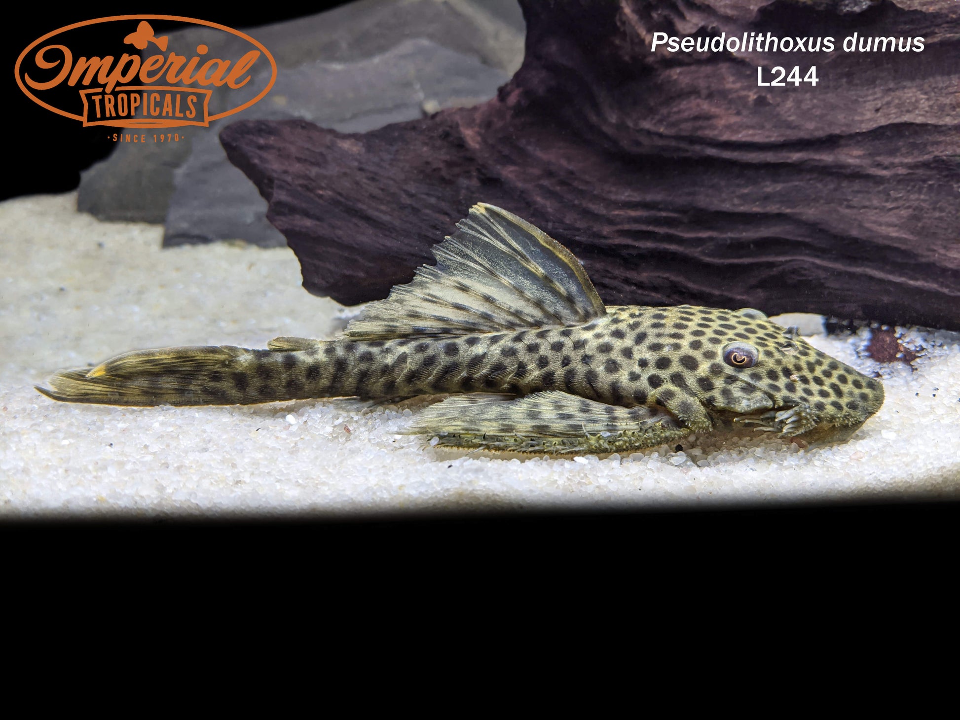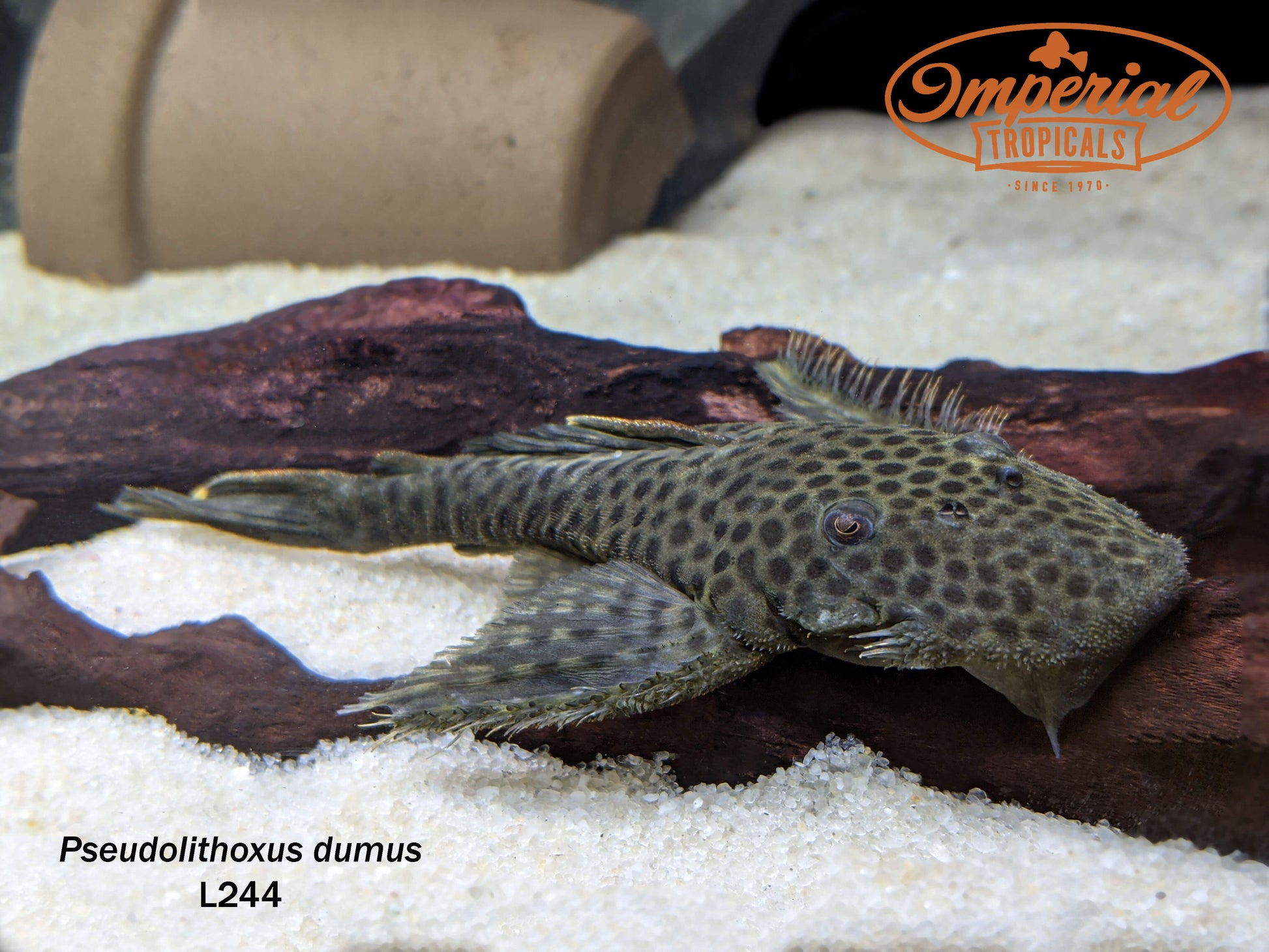 Remarks: The L244 Pleco (Pseudolithoxus dumus), nicknamed the Dumus Pleco or Black Spotted Flyer Pleco, comes from the Colombian Orinoco and Atabapo Rivers. They are primarily an algae grazer and need a high content of biofilm in the tank. They are dark brown with small black spots covering their entire body and fins. As they age, their pectoral fins lengthen to up to 2" long and grow long odontodes, as seen in the photo. From above, these Flyer Plecos really stand out from other Loricariids!