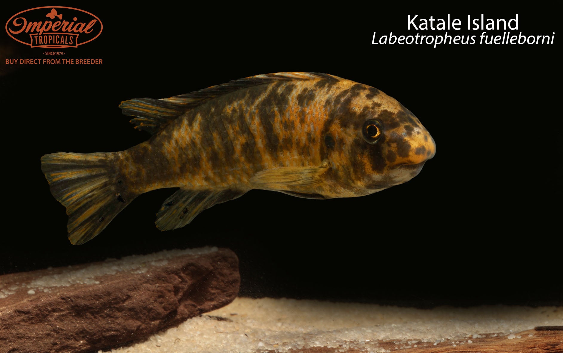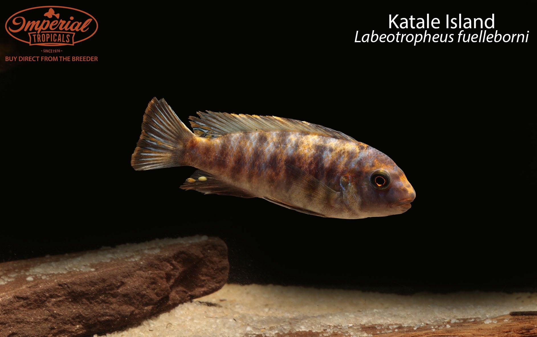Remarks: Labeotropheus are easily distinguished from other mbuna genera by their curved, hanging snout. This special adaptation allows them to graze on rocks on an almost parallel plane, letting them feed on rocks that other fish may not be able to reach. Male Katale Island may be solid blue or OB patterned. Females are OB.