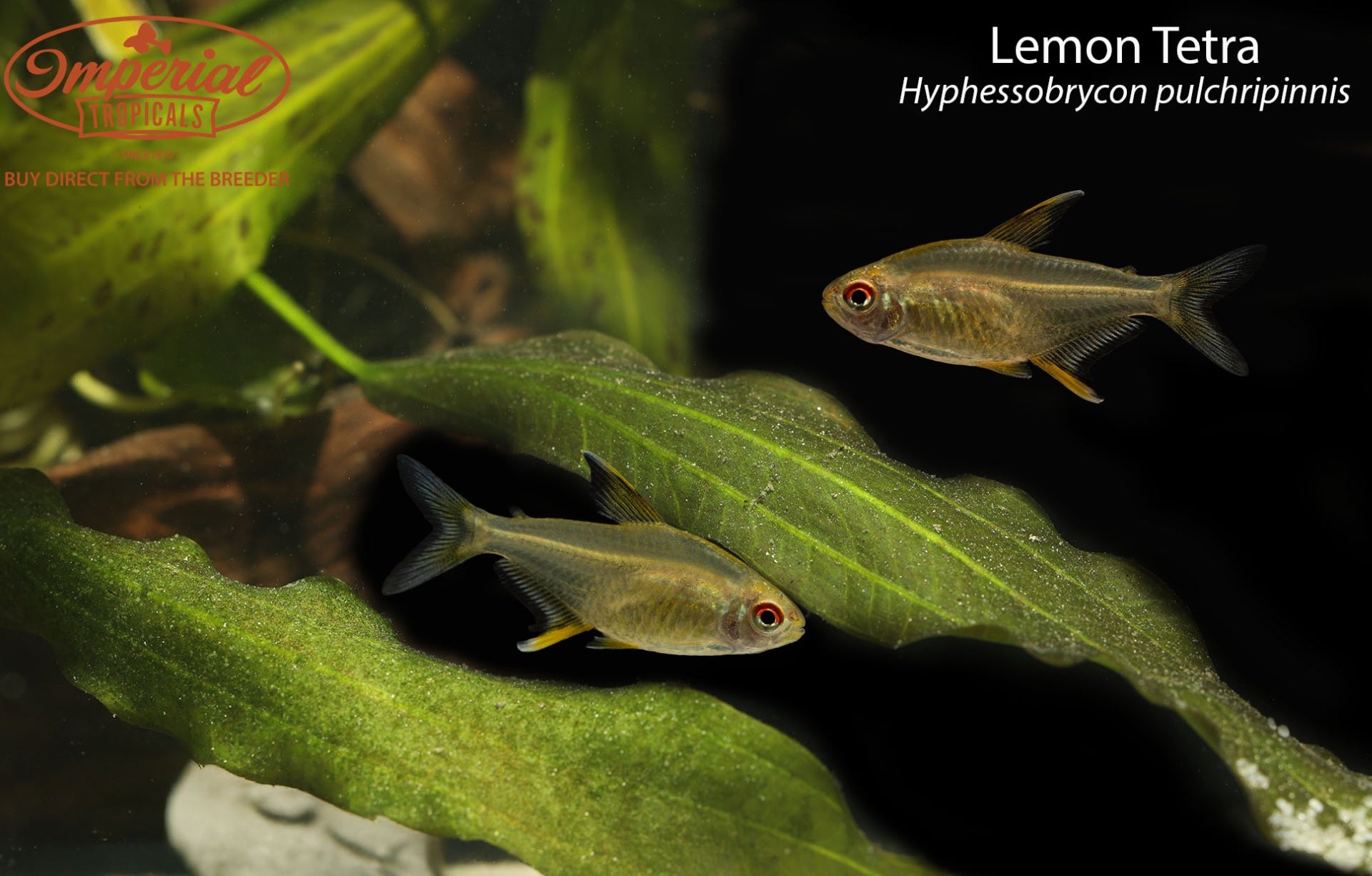 Remarks: Lemon Tetras (Hyphessobrycon pulchripinnis) develop bright yellow bodies with red eyes as they age and settle into their tank. When young or stressed, they may appear to be white or gray fish without any color. To encourage their best colors to show, it is best to keep them in groups of 6 or more.