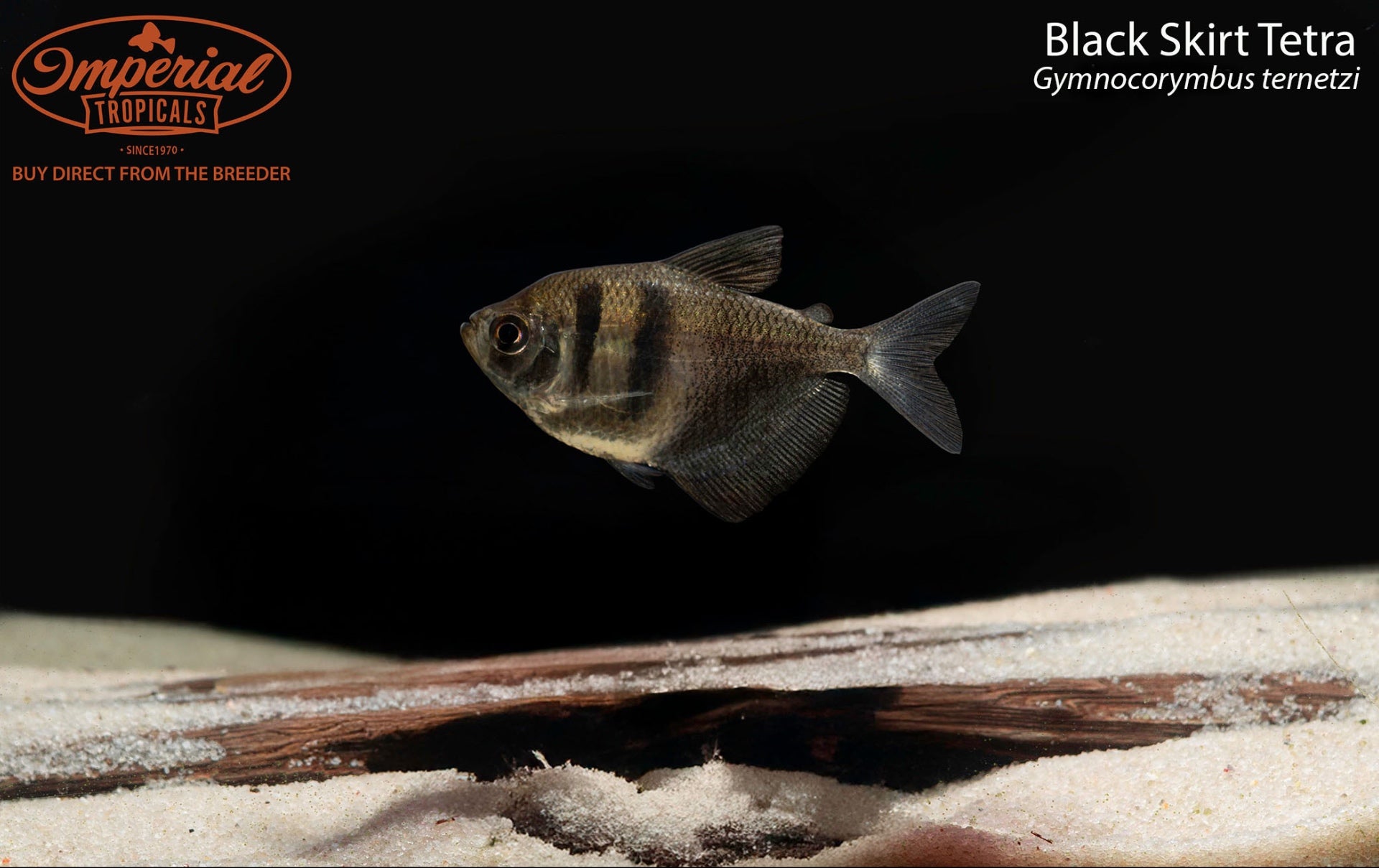 Remarks: Black Skirt Tetras (Gymnocorymbus ternetzi) are tall-bodied, silver tetras with black, flowing fins. Males will have much darker bodies than females, but both sexes show a good amount of color.