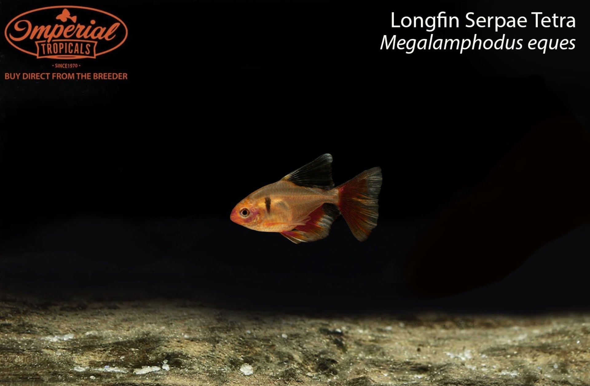 Remarks: Serpae Tetras are a medium sized tetra with bright red bodies and black dorsal fins. Occasionally their ventral and anal fins get white tips that provide great contrast. Being a shoaling species, they should be kept in groups of six or more. They can be somewhat nippy towards others, especially slow-moving species or long-finned species, so care should be taken when choosing tank-mates. These fish were selectively bred over many generations to have long, flowing fins.