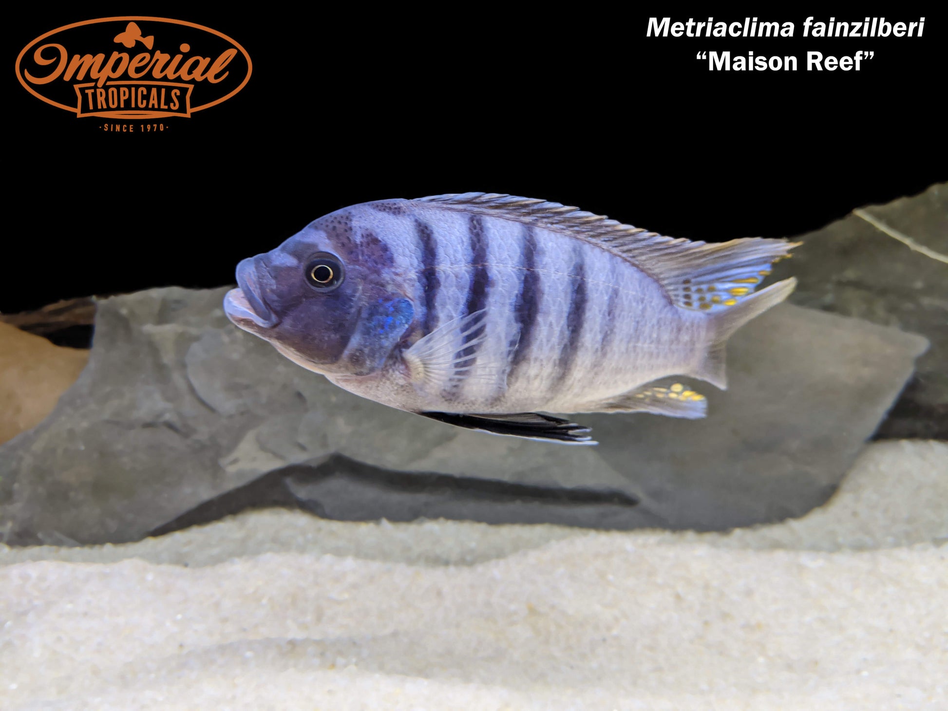 Remarks: Metriaclima fainzilberi (formerly M. sp. Zebra Chilumba) come from Maison Reef in Malawi. Males control caves along the reef where they attract females to mate. Males are light blue to white with thick black bands running vertically from their gill plate to their caudal peduncle. They also have black bridle-like markings on their face.