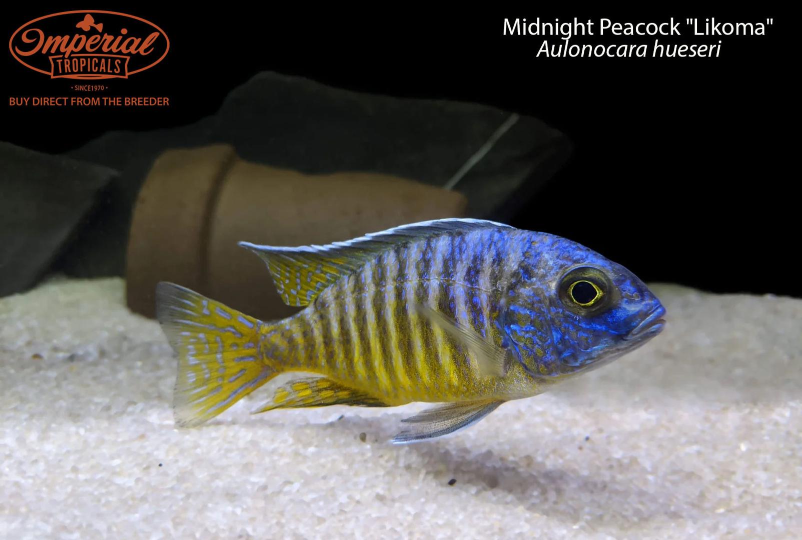 Remarks: Male Midnight Peacocks (Aulonocara hueseri) display yellow bellies with blue backs, while females are gray. The dorsal fin of males turns dark black when they are fully mature. They are endemic to Likoma Island on the eastern side of the lake.