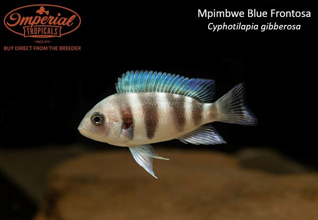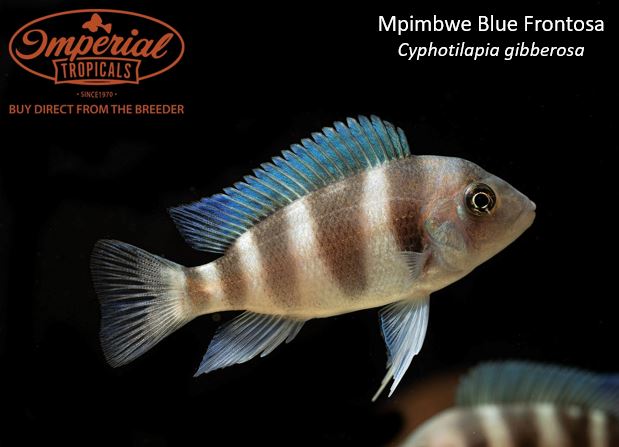 Remarks: Mpimbwe blue frontosa are from the southern end of Lake Tanganyika and are actually not a true frontosa in a taxonomic sense. This is because they have the scientific name of Cyphotilapia gibberosa instead of Cyphotilapia frontosa. Many hobbyists have noted this species does not get as big of a hump as true frontosas, but the trade off is their beautiful color. Upon maturity and when in the right conditions, Mpimbwe blue frontosas display more blue coloration than silver. A good way to identify this locality is to look at the the black band over their eyes. Instead of a vertical stripe, their have a horizontal band that spans between their eyes forming a sort of mask. However, this marking typically does not show up until the fish is older, usually at 3-4" in length, and can disappear if the fish is stressed.