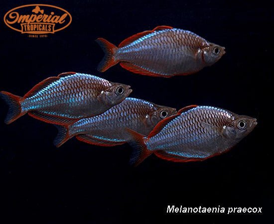 Remarks: Melanotaenia praecox, or the Neon Dwarf Rainbow, is a small species from West Papua. Both sexes exhibit bright, shining blue bodies with colorful fins. The fins of the males will be bright red, while females have orange-yellow fins. Because of their small size, they make an excellent choice for smaller community tanks or breeding projects.