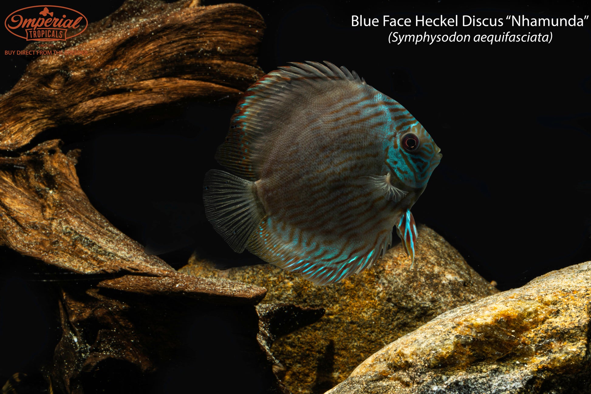 Remarks: Heckel discus are one of the most colorful, challenging to keep, and oldest known wild discus variants. They display vibrant yellows, oranges, greens, and blues that vary in amount and pattern depending on the exact locality they are sourced from. Typically, Heckel discus are identified by the particularly wide and dark band that runs down the center of their body that is particularly round even for a discus. The Nhamunda blue face Heckel discus is a highly sought after locality as they display some of the most electric blue coloration found in any wild discus with most of it concentrated toward their heads. For some, this color is so rich it covers up the orange striping near the face. This combined with them being found in the Rio Nhamunda is where they get their common name. Care should be taken in regards to water parameters as these discus are wild and much less tolerant of incorrect water parameters. For the best chance at being successful, keep them in very soft, acidic, warm water and perform frequent water changes.